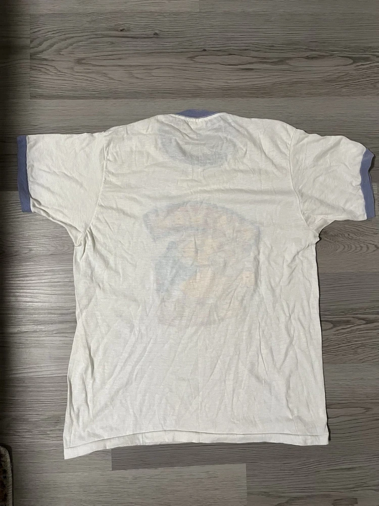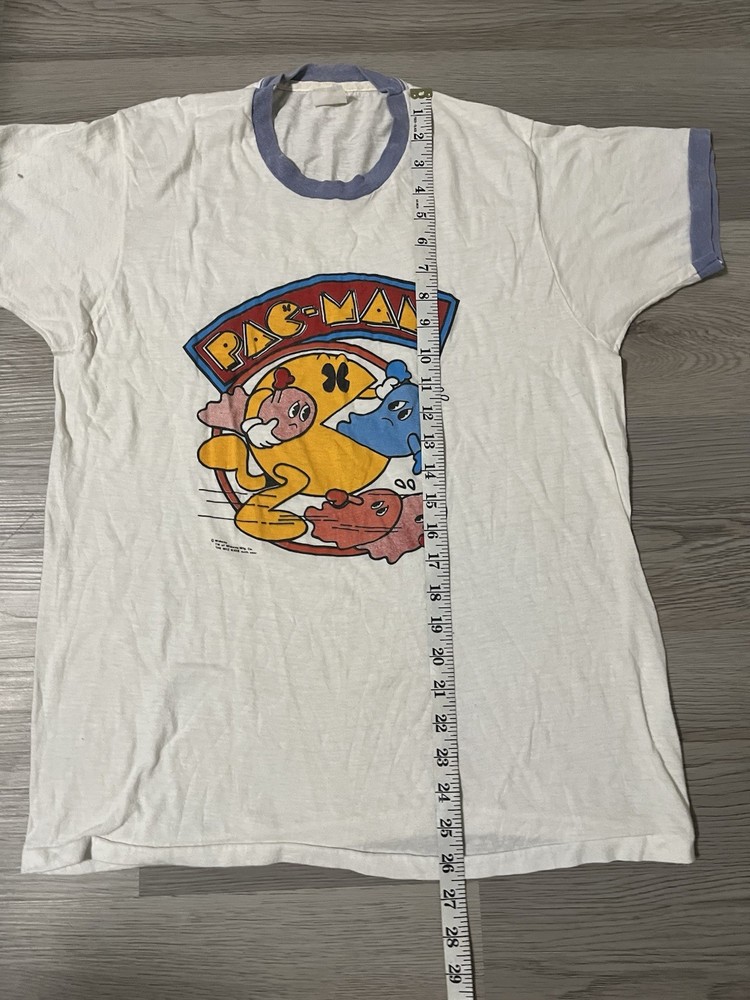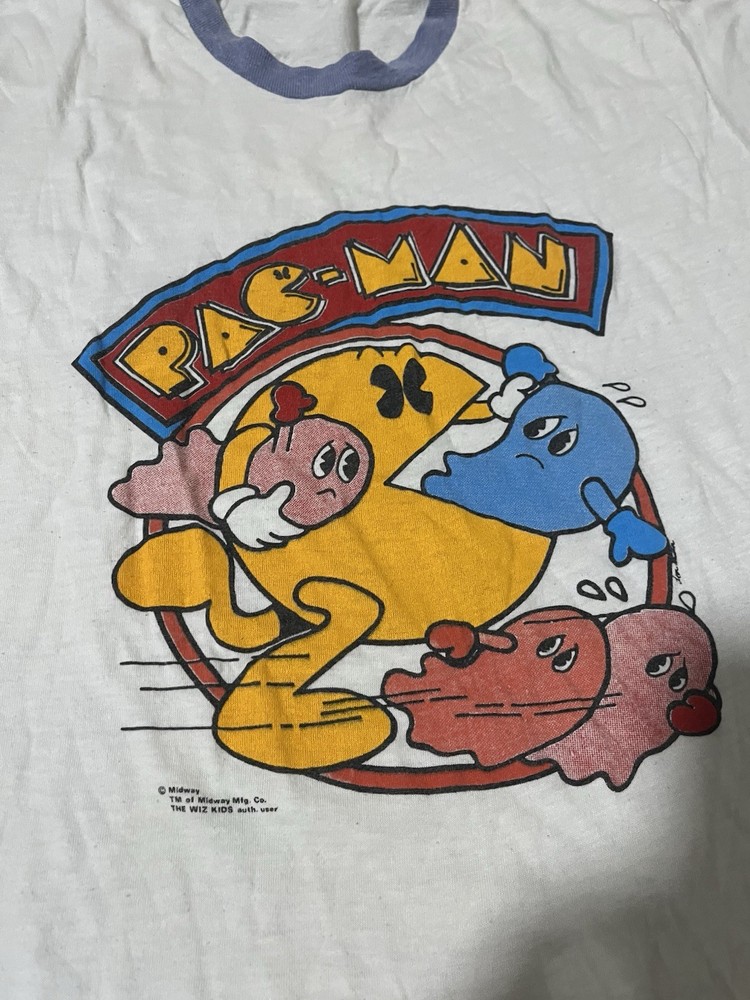 Embrace the nostalgia of the 80s with this classic Pac-Man ringer tee from Hanes. Crafted in 1981, this vintage shirt showcases the iconic graphic that captures the essence of the era's video game craze. Offered in a versatile white color, the short-sleeve design is perfect for casual outings or adding a retro touch to your modern wardrobe. This unisex tee is made from a comfortable blend of cotton, ensuring a soft feel against the skin. Designed to fit a size medium (Men's) or a size large (Women's), it features a timeless ringer style that was all the rage in the decade. Whether you're a collector of vintage apparel or just love the look and feel of 80s fashion, this shirt is sure to be a cherished piece.