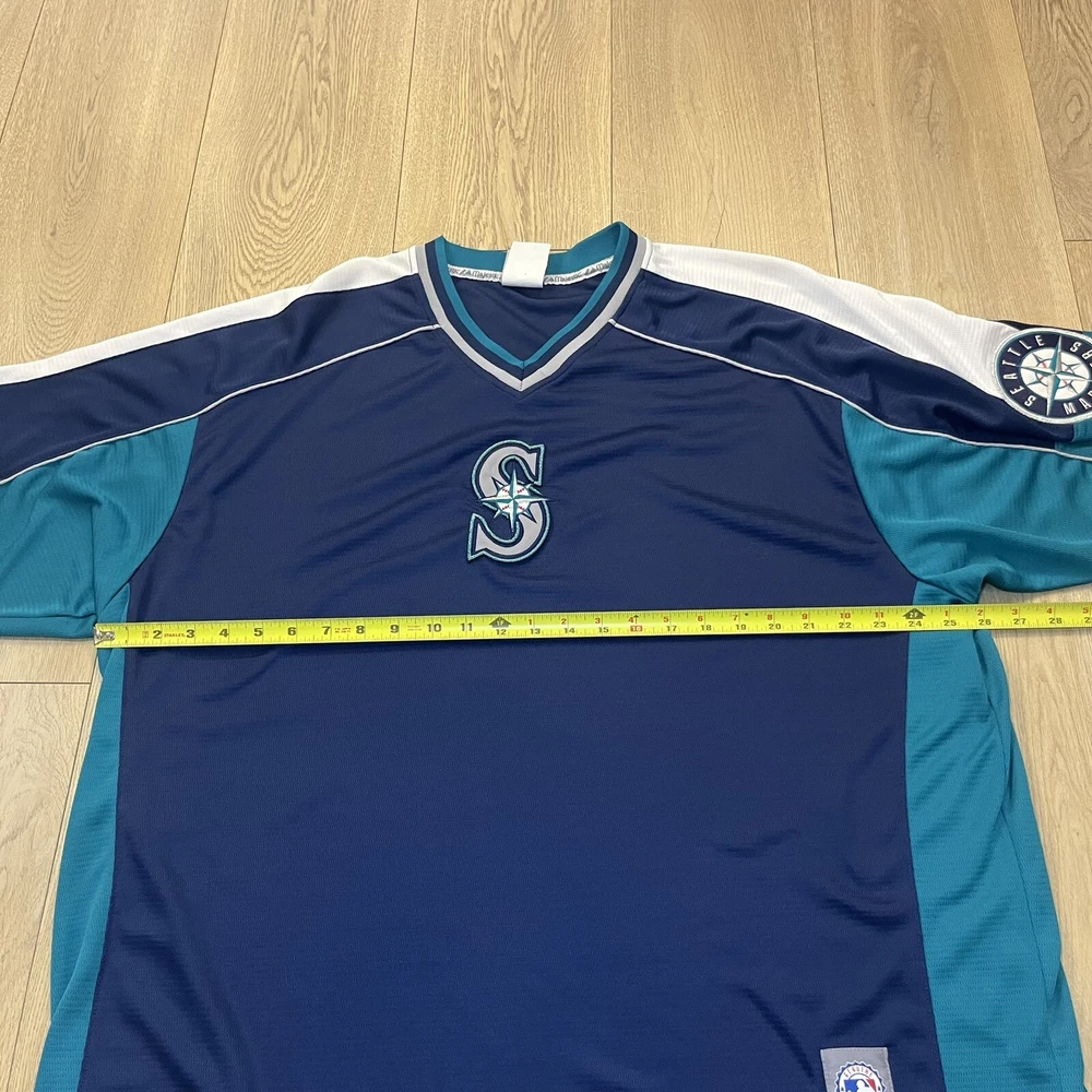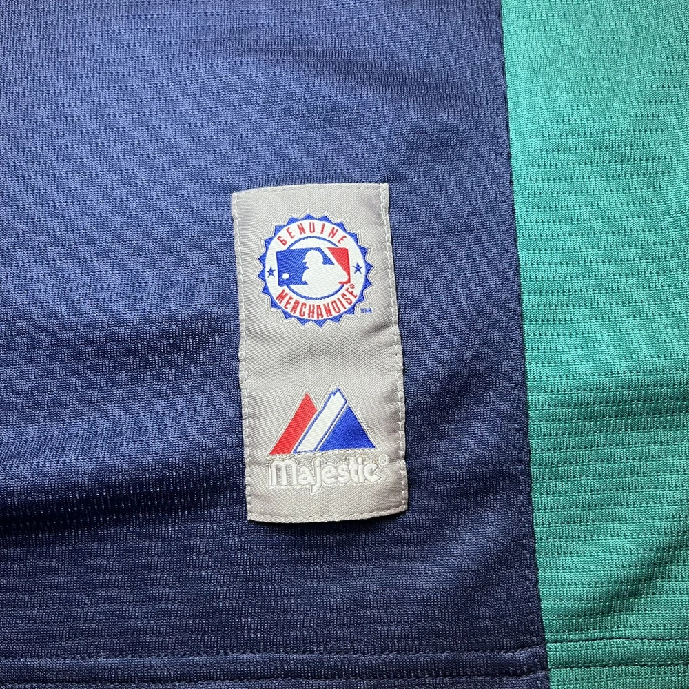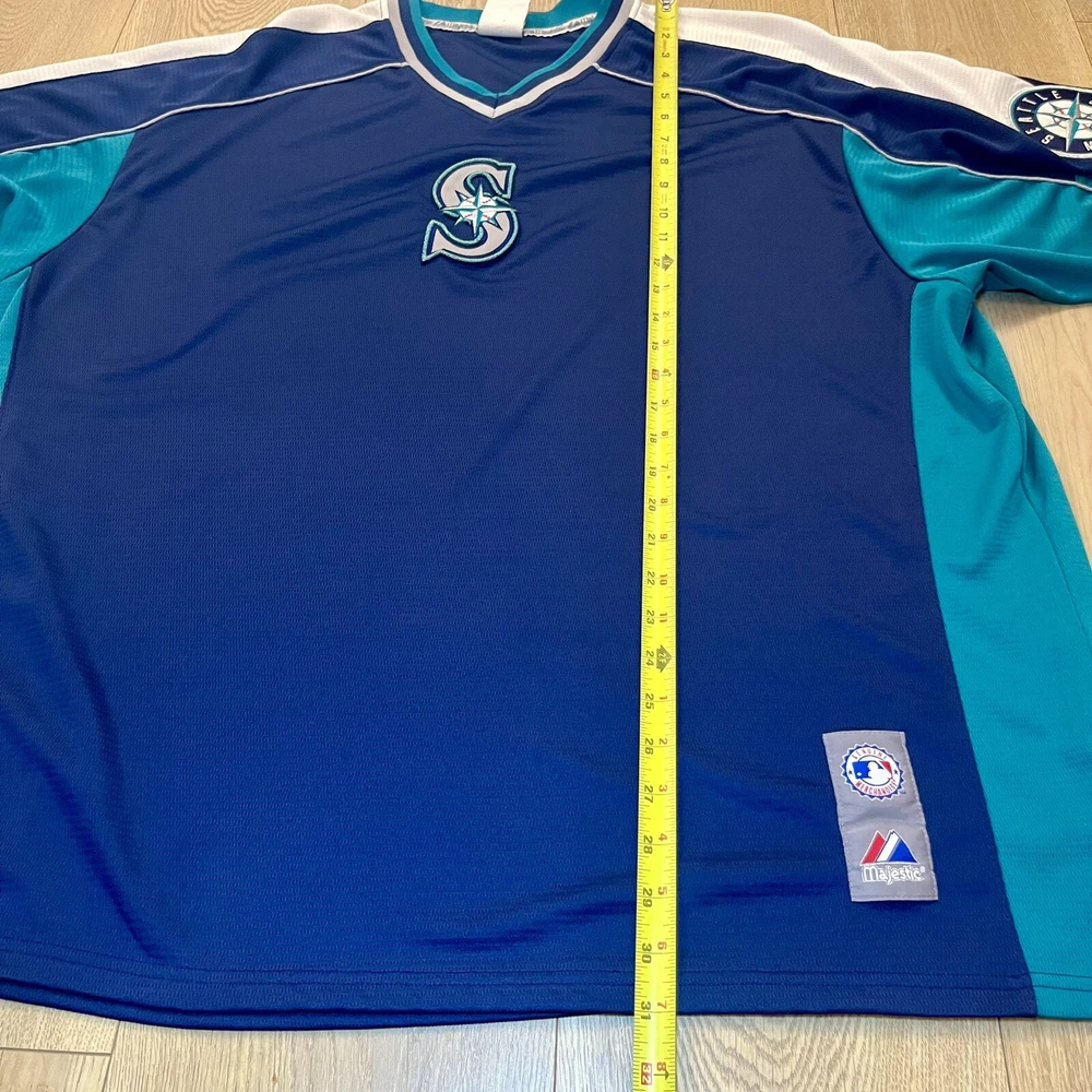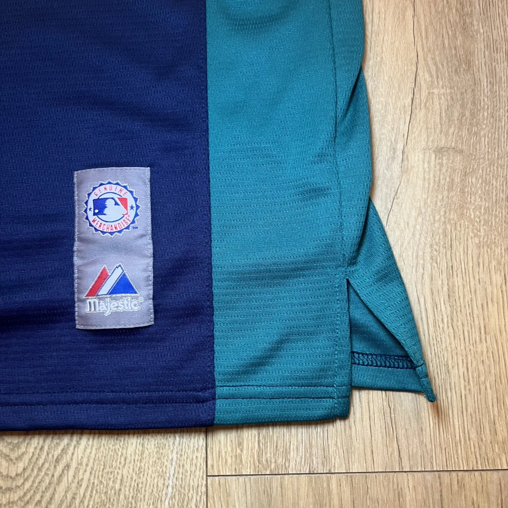Show your support for the Seattle Mariners with this vintage 90s Majestic pullover jersey. Featuring the team's iconic blue color scheme, this unisex adult jersey is perfect for any baseball fan. The jersey is officially licensed by Major League Baseball (MLB) and is made in Indonesia with high-quality materials. With a 26-inch chest and a 21-inch collar to the bottom, this jersey is the perfect size for any fan. It's great for wearing to games or just out and about to show off your team spirit. The jersey has a capacity of 12 oz and features the Seattle Mariners team logo on the front. Get yours today and show your support for one of the most iconic teams in baseball history.