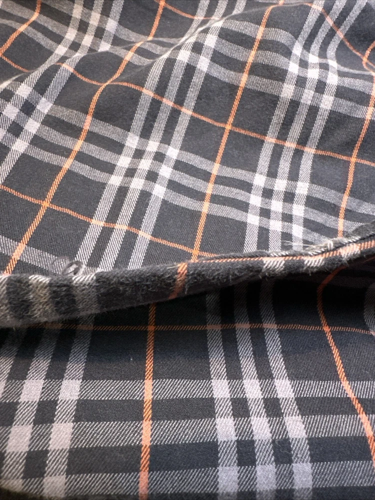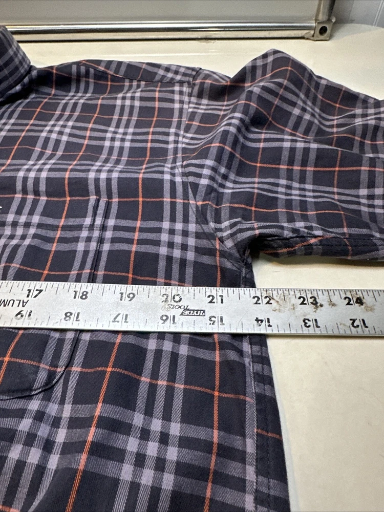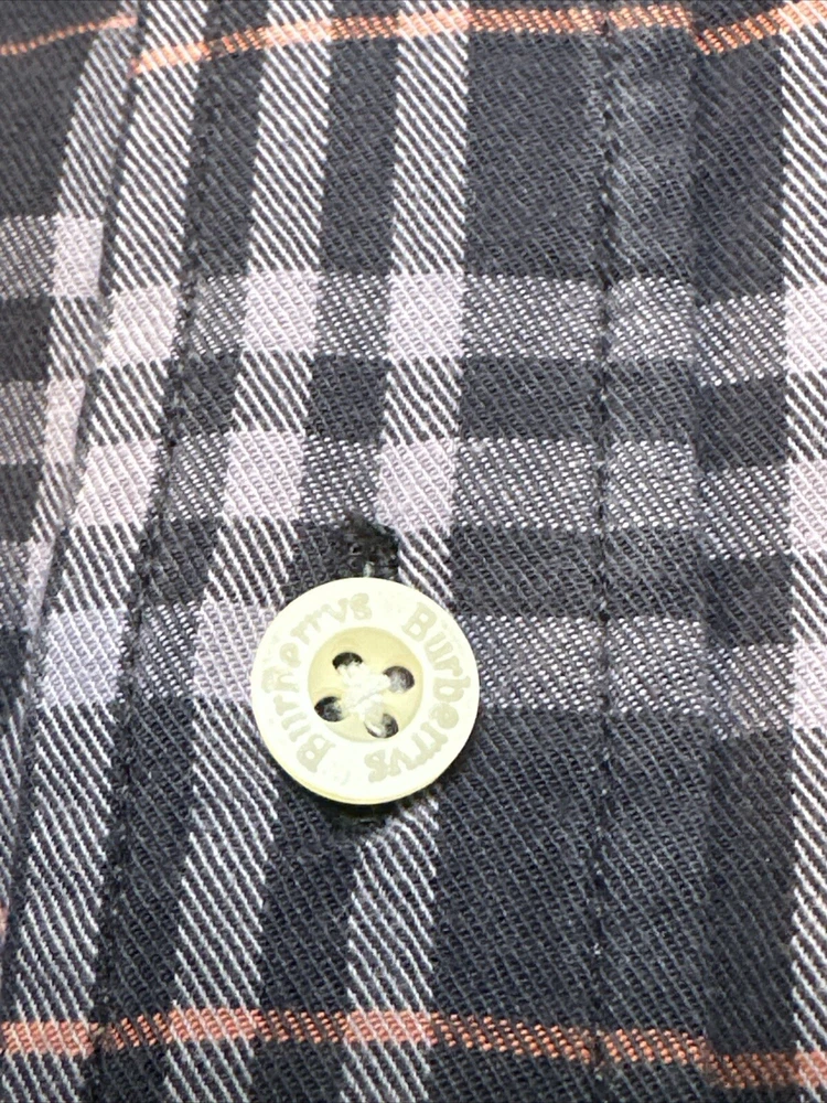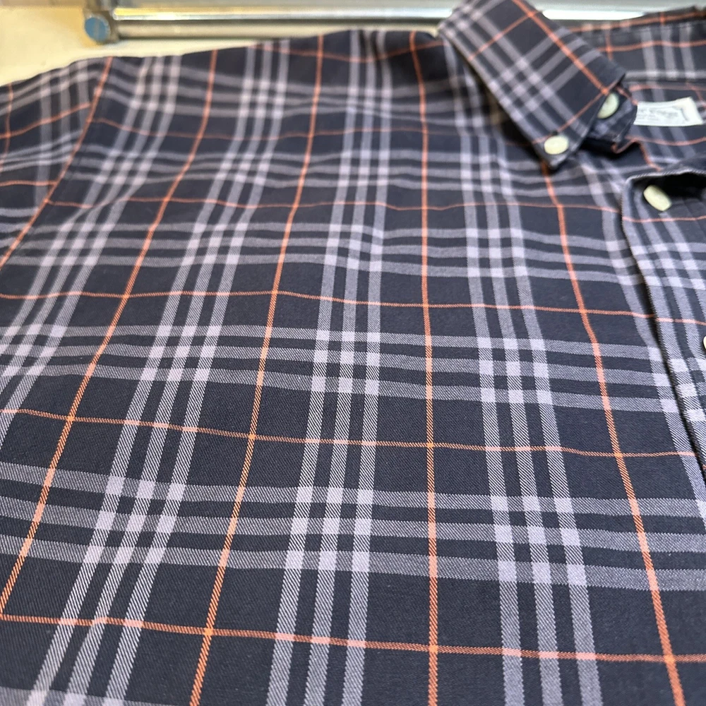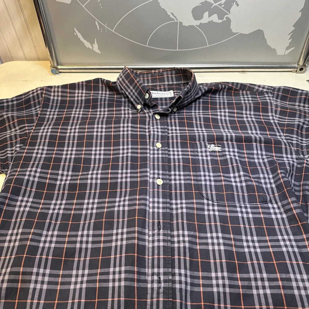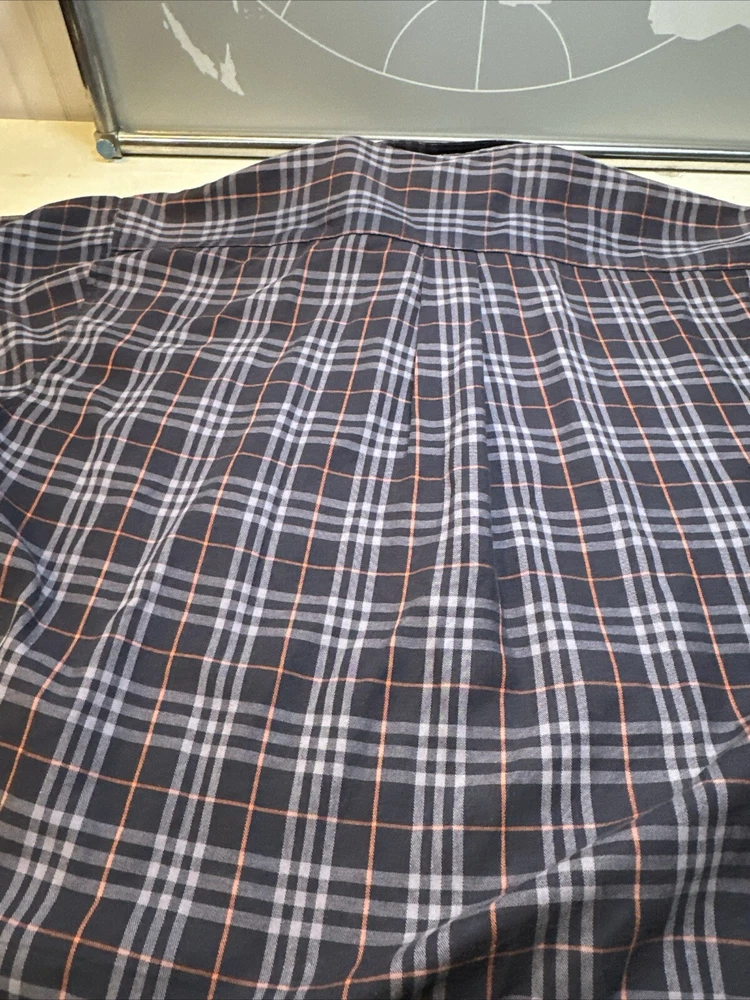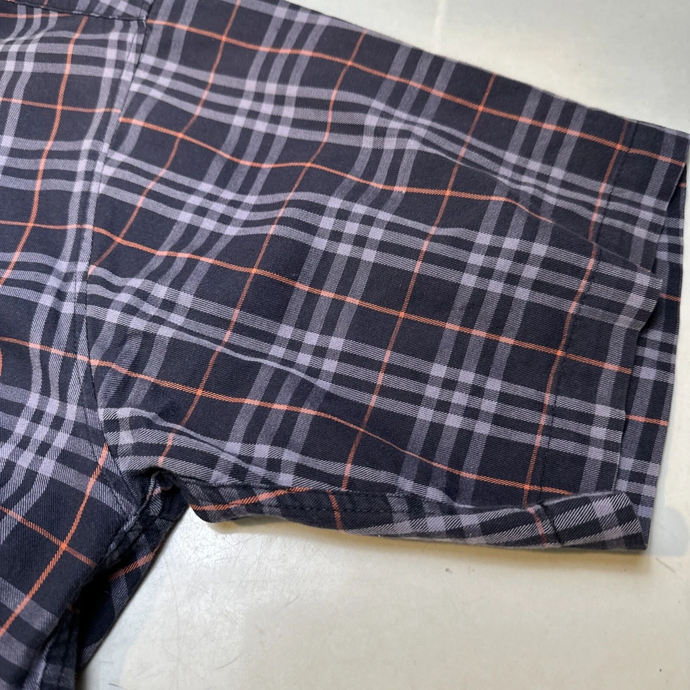 Elevate your wardrobe with this classic Burberry Nova Check button-up shirt. Made of 100% cotton, this navy plaid shirt features short sleeves and a collared neckline, making it perfect for travel, casual outings, or business meetings. The shirt is vintage from the 90s and has a regular fit, with button accents and a woven fabric type. The Burberry shirt is perfect for men who want to add a touch of vintage style to their wardrobe. The Nova Check pattern and 90s theme make it a unique and stylish choice for any occasion. This shirt is available in size L and is a great addition to any collection. In excellent used condition. A couple of pulled threads on bottom see pics