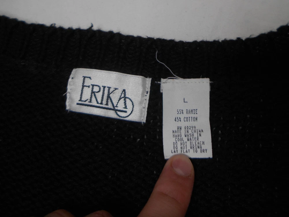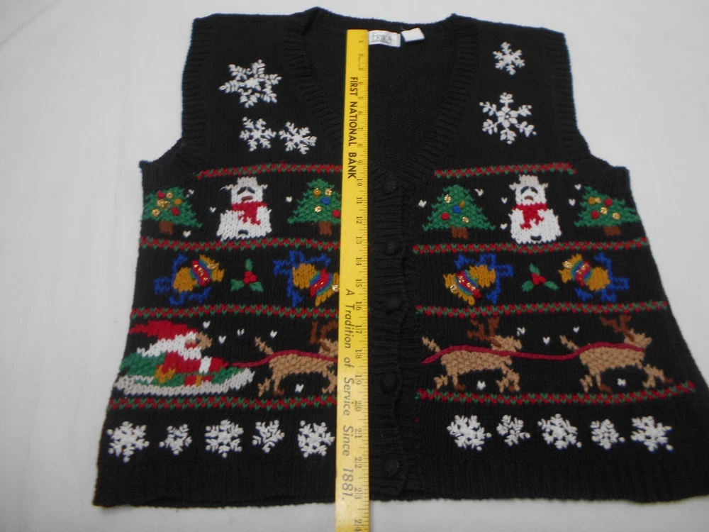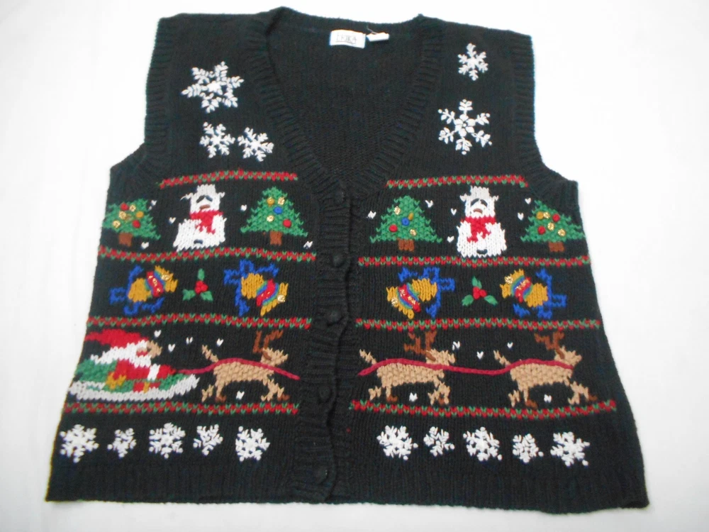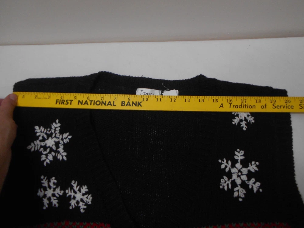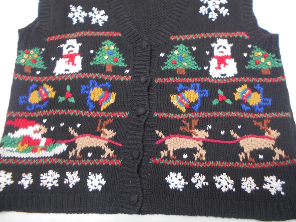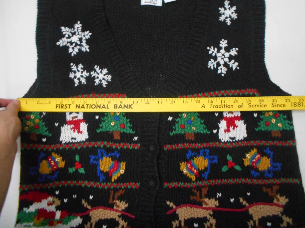 This Item of Used clothing has some wear and such from use and age. All of the things that are wrong with it can be found in the condition description and also there are pictures of them as well. Also the measurements are included in the photos near the end. Please refer to both before buying. Message me if you have any questions! Cozy up this holiday season with the Vintage 90s Erika Christmas Cardigan Sweater. Featuring a classic black cotton blend fabric, this cardigan is adorned with a festive Santa and reindeer design, perfect for adding a touch of retro cheer to your holiday wardrobe. The Granny Large size ensures a comfortable fit for those who prefer a relaxed, yet stylish silhouette. Designed with a versatile cardigan style, this piece can be easily layered over your favorite long-sleeved tops or dresses. The sweater is a great addition to any Christmas-themed outfit or for someone who loves to blend vintage style with modern comfort. Whether you're decking out your tree or enjoying a cozy evening, this ERIKA sweater will keep you warm and fashionable.