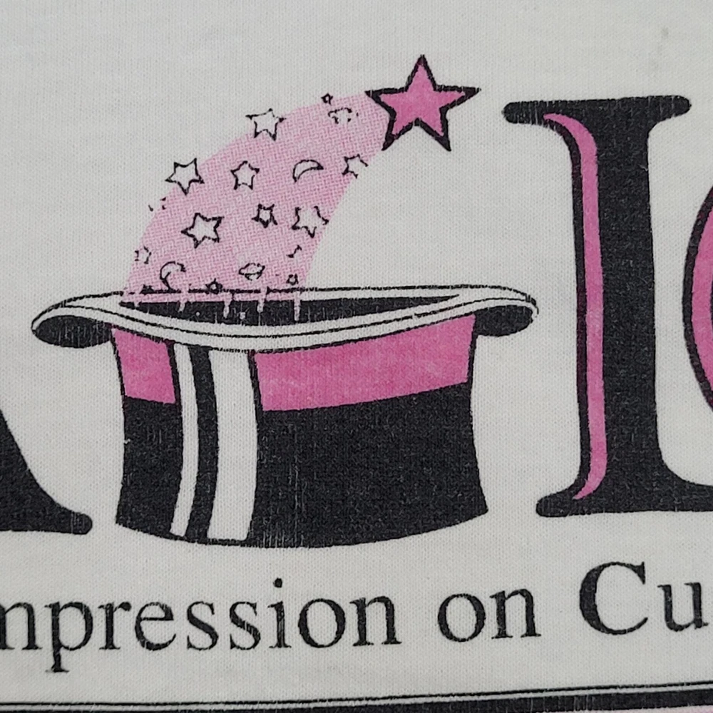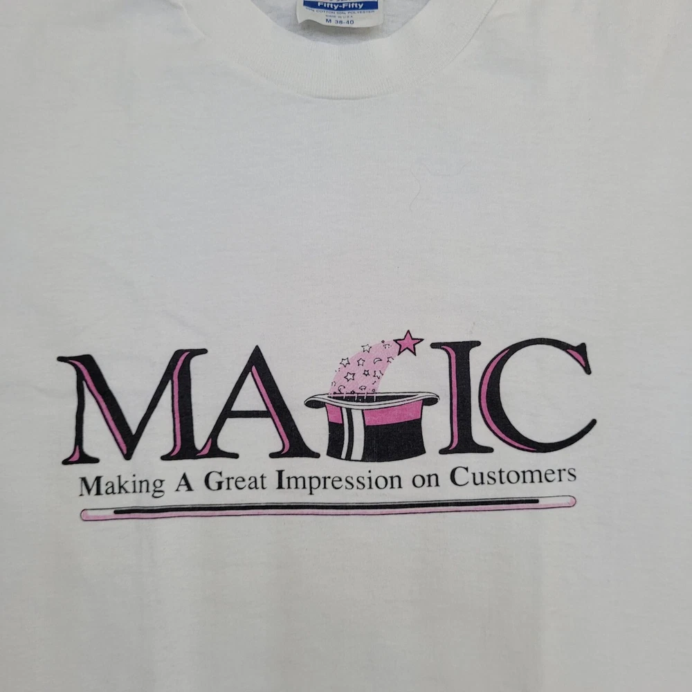 Vintage 90s Funny Customer Service Shirt Womens M 19x25 Magic Hat Wand USA Add humor to your wardrobe with this vintage 90s funny customer service shirt. Perfect for a quirky retro look! * Used condition * Length is on the shorter side * No rips/holes * Stains (see picture and zoom in to see size/location) * Normal fading from washing * Normal cracking on the graphic VINTAGE FUNNY SHIRT, 90S FASHION, CUSTOMER SERVICE, MAGIC HAT, MAGIC WAND, WOMEN'S SHIRT, USA, RETRO STYLE, 19X25 SIZE, VINTAGE CLOTHING 64502