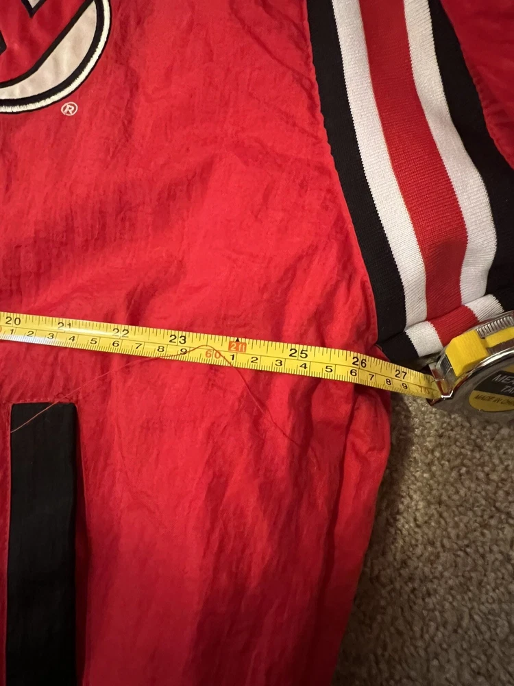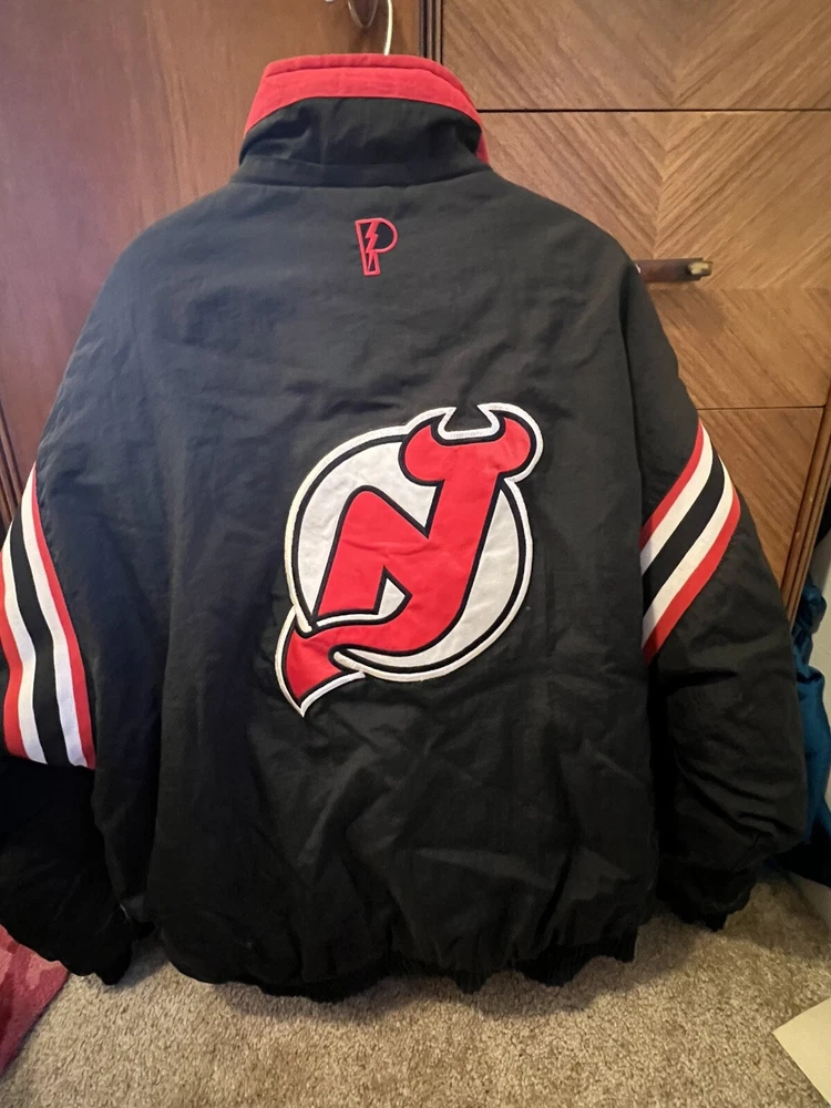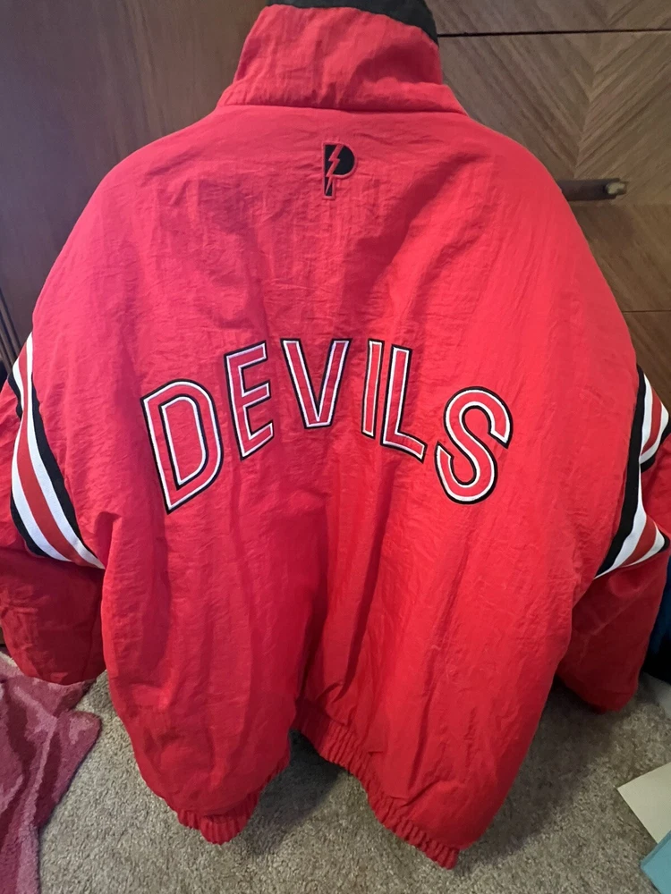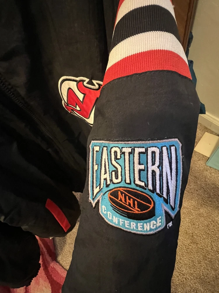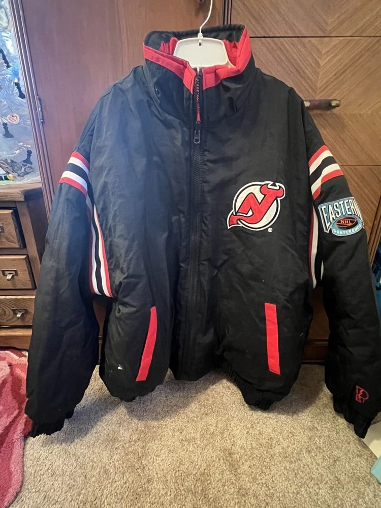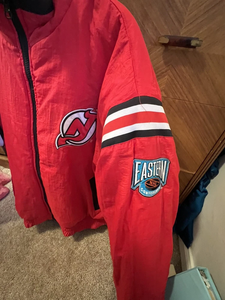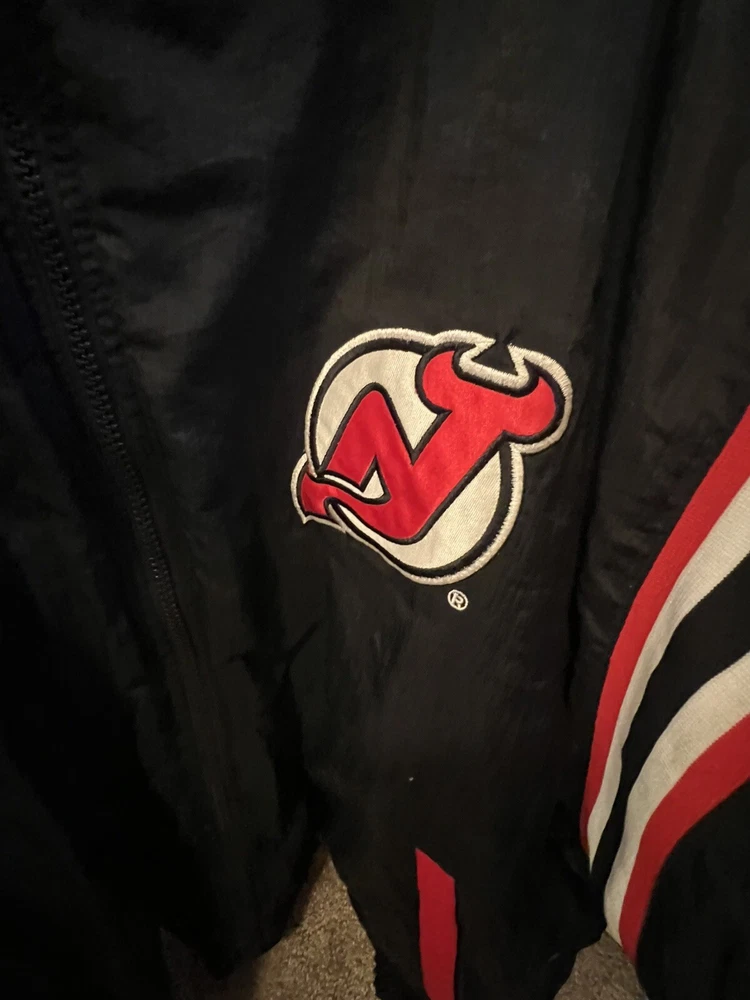 Represent the New Jersey Devils with this vintage 90s puffer jacket. This reversible jacket features the team's logo on both the inside and outside, making it a rare find for any Devils fan. The jacket is made with high-quality materials and is officially licensed by the National Hockey League. Perfect for the regular season, this jacket is perfect for any game day or casual wear. The jacket is sized XL and is suitable for men of all ages. This rare piece of fan apparel is a must-have for any true Devils fan. Rare in perfect shape. There is no hood. Not sure if one came with it bin free shipping