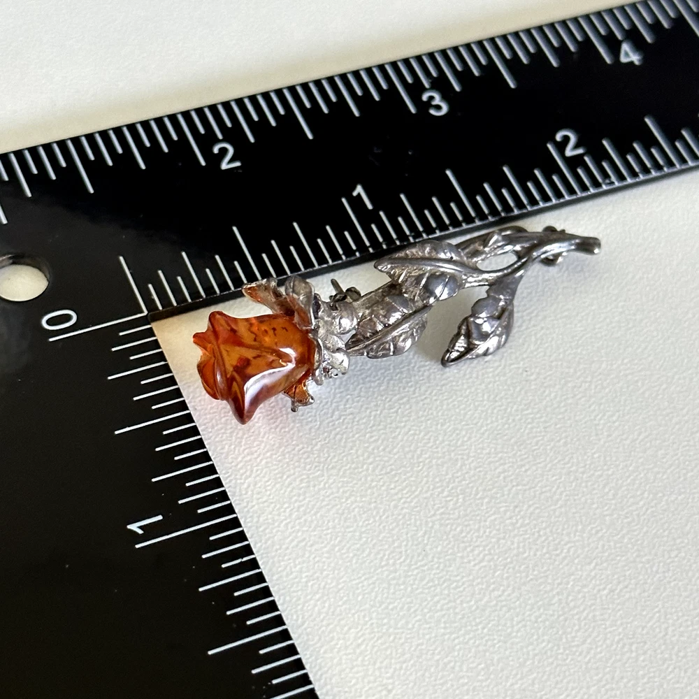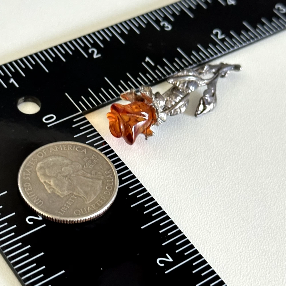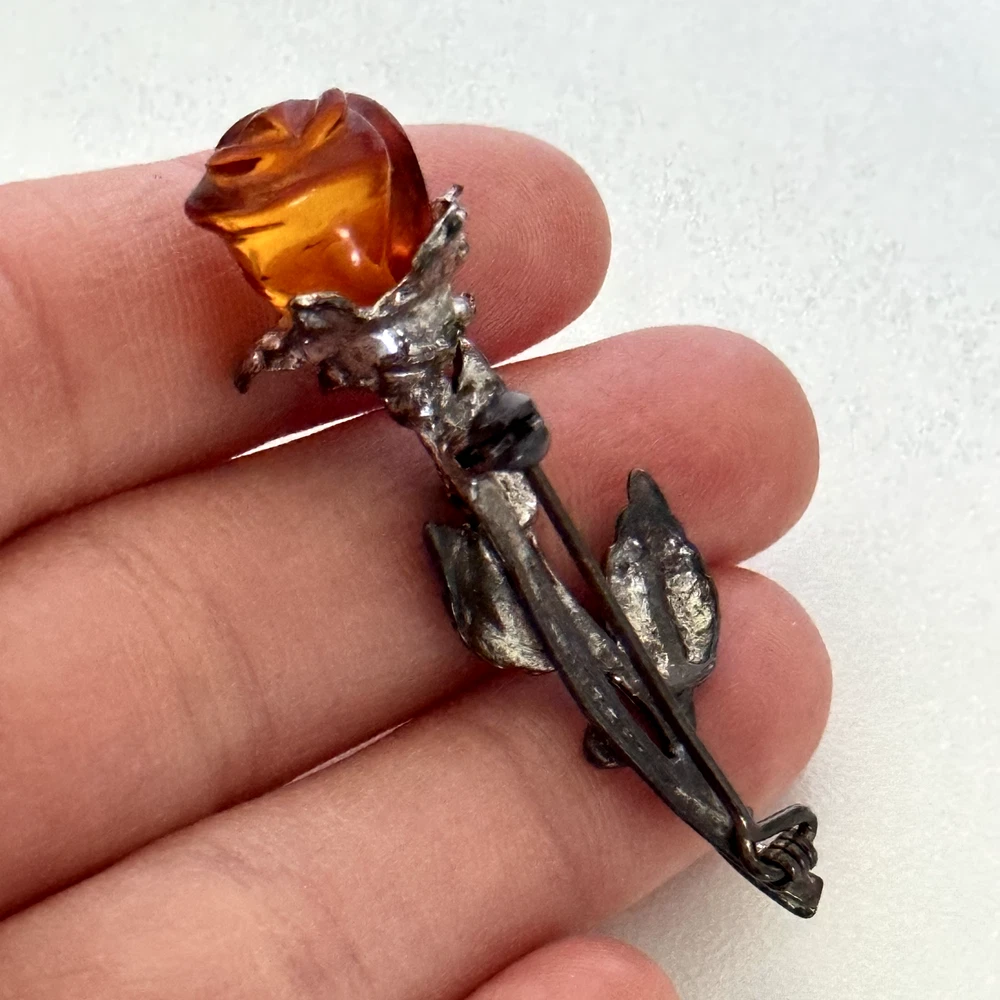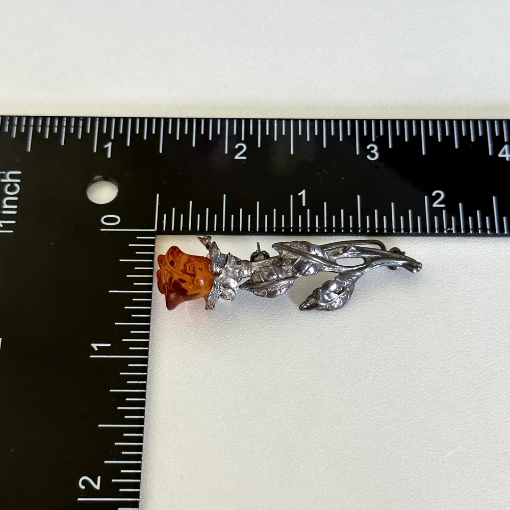 Lovely Vintage 925 Sterling Silver Baltic Amber Carved Rose Flower Brooch Pin Measurements: Just about 2" x 3/4" Weight: 5.4 grams Tested for sterling silver. Very good vintage condition. Shows patina. Pin part works perfectly. - Fast shipping, I ship the same or next business day! I also combine shipping. - Thank you so much for shopping with me and please check out my other jewelry listings, I post new pieces daily!