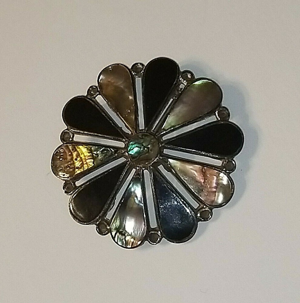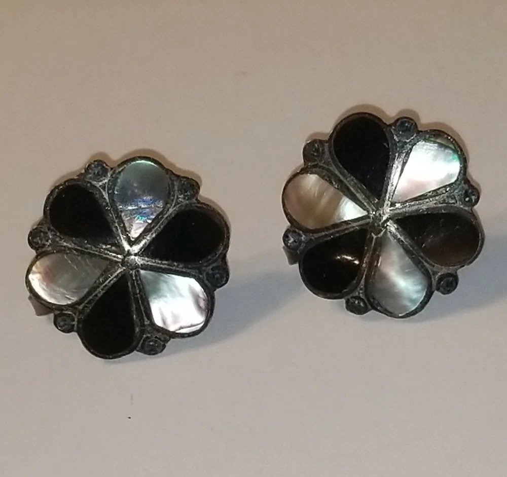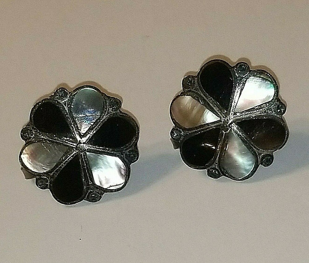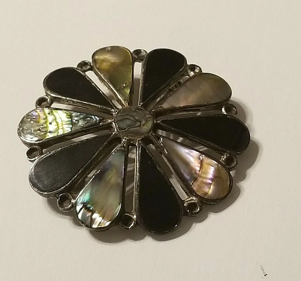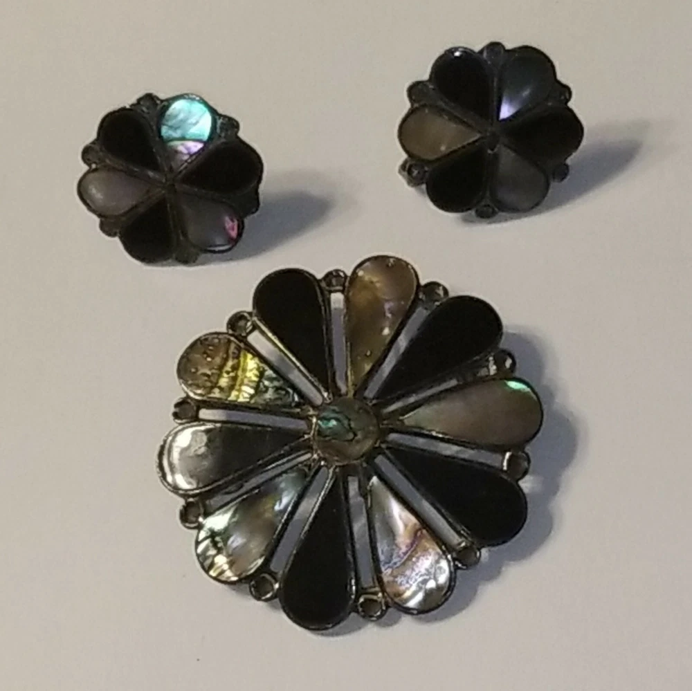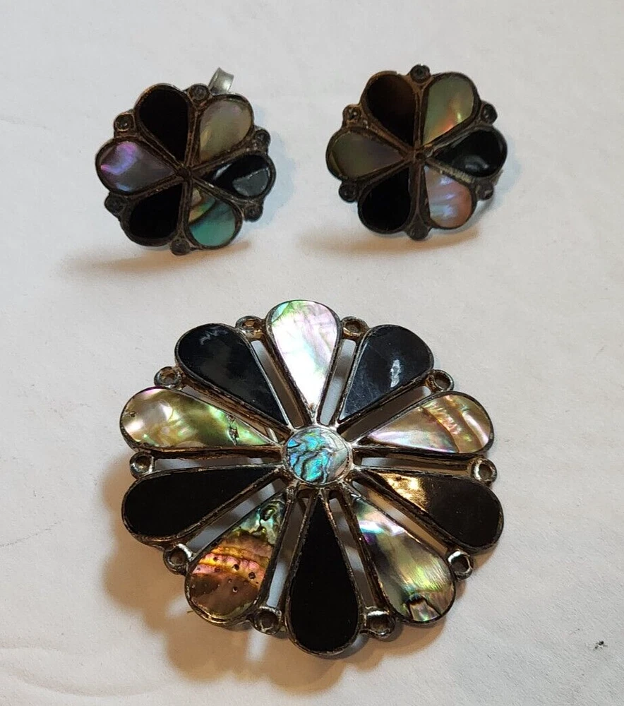 A vintage set, screw-back earrings and a pin/brooch. The pin is flower shape with every other section abalone, then black onyx. The pin is 1 5/8" across. On the back it's stamped Sterling Mexico 925. and Gonzalez and one more stamp, i'm assuming the hallmark. The matching earrings have a screw back, 3/4" across. They are very similar to the pin, but there is no space between the 'petals' on the earrings. It looks like a hallmark stamp on the back of one earring. Buyer to pay shipping of $5.00