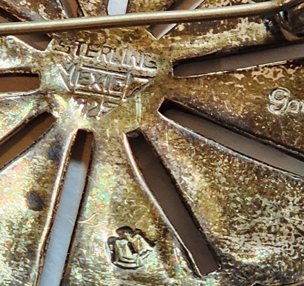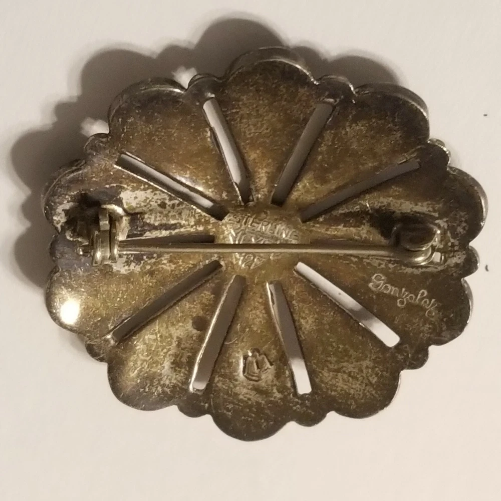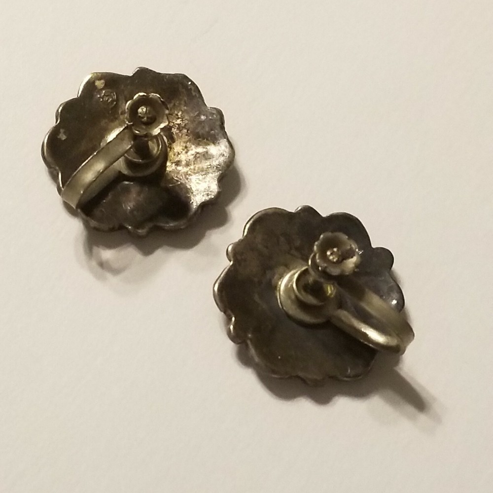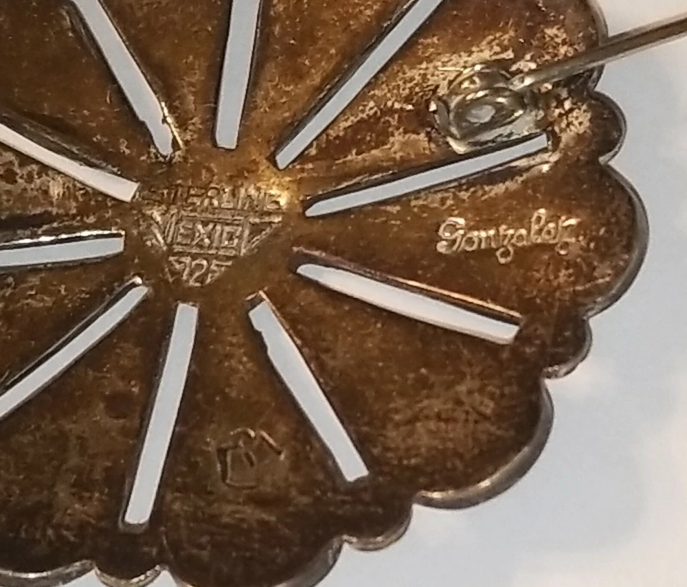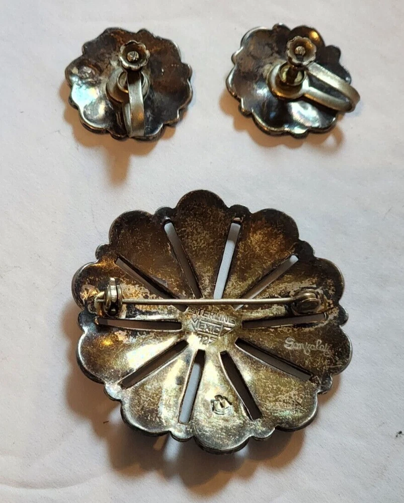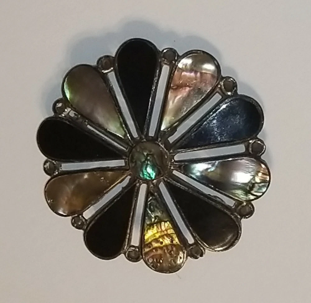 A vintage set, screw-back earrings and a pin/brooch. The pin is flower shape with every other section abalone, then black onyx. The pin is 1 5/8" across. On the back it's stamped Sterling Mexico 925. and Gonzalez and one more stamp, i'm assuming the hallmark. The matching earrings have a screw back, 3/4" across. They are very similar to the pin, but there is no space between the 'petals' on the earrings. It looks like a hallmark stamp on the back of one earring. Buyer to pay shipping of $5.00