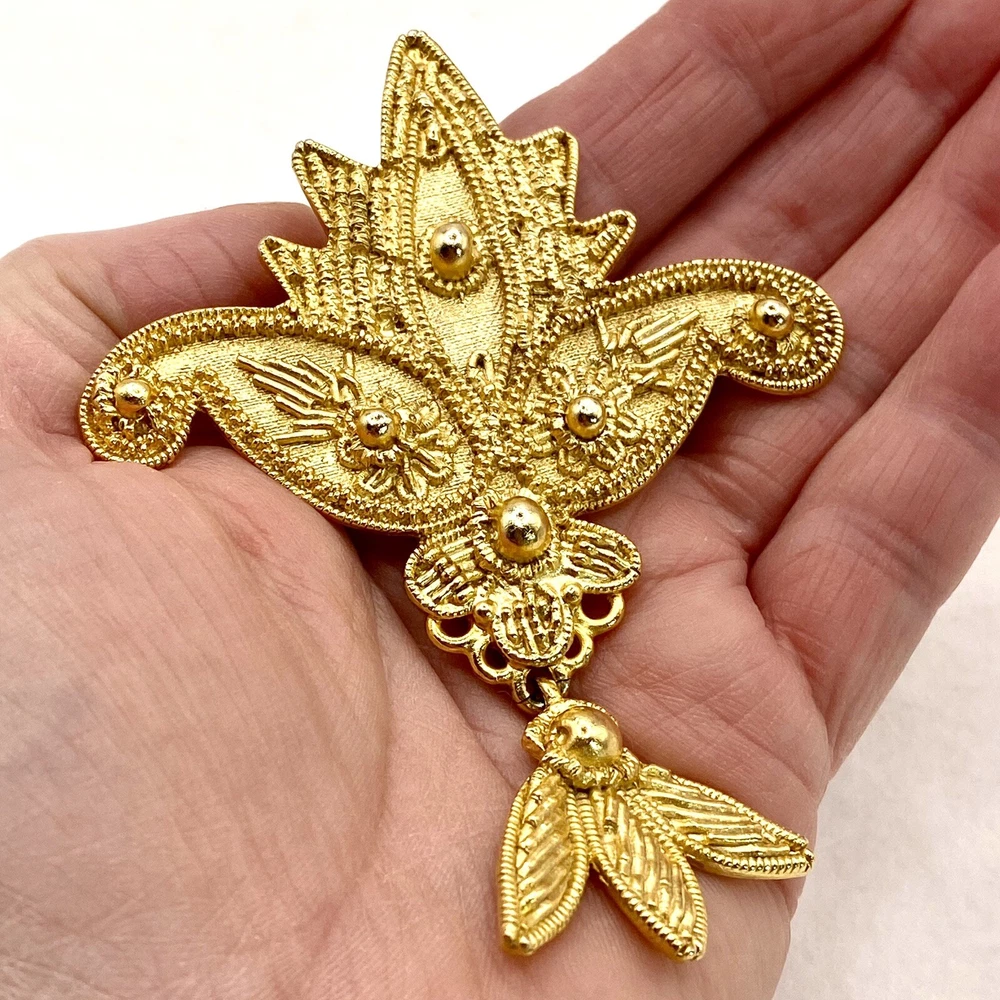 Add a touch of vintage beauty to your outfit with this stunning goldtone Les Fleur articulated scroll filigree large brooch pin from AJC. The intricate flower design is perfect for any occasion, whether it's a wedding, graduation, or just a casual day out. The pin is 3.75" in length and features eye-clean gemstones with excellent cut grade. This unique piece is perfect for those who love nature, art, and family & friends. It's a great addition to any collection and makes a perfect gift for Mother's Day, Father's Day, Christmas, or Valentine's Day. Whether you're a collector or just looking for a beautiful accessory, this brooch is sure to impress. Vintage Goldtone Les Fleur Articulating Scroll Filigree Large Brooch Pin State Y. This brooch is in excellent condition This is a pre-owned piece. It may require cleaning. There may be scratching, fading, chips, normal wear, missing stones, etc… See Photos. If you have any questions, please feel free to contact me via eBay w. Thank you for stopping by. Make sure to check out other items in my store. Your satisfaction is my priority. Have a wonderfnnul blessed day!
