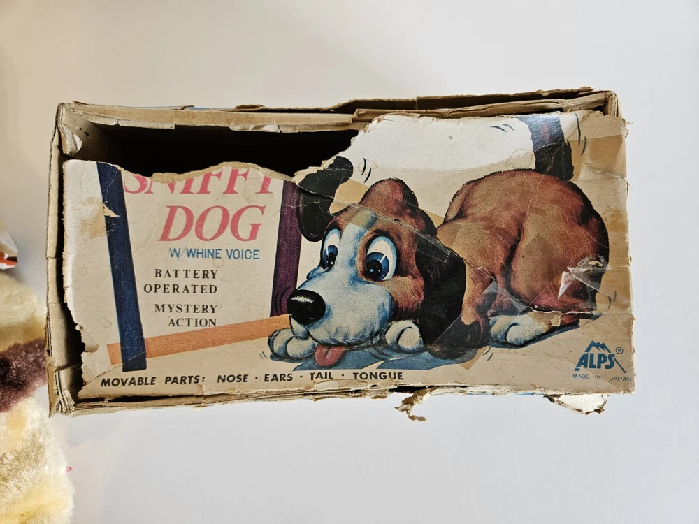 This listing is for 1 Sniffy Dog toy & box as shown in the pictures. ALPS Sniffy Dog battery operated toy, made in Japan. The dog is incredibly clean and works perfectly as far as I can tell. His nose, tail, tongue and ears all move. The battery well is clean (pictured above). The box is in rough condition with a small piece that is no longer attached. This toy takes 2 D batteries. - Please message me if you have any questions or if additional pictures are required! - Usually ships out next business day. - Listing comes from a smoke-free home.
