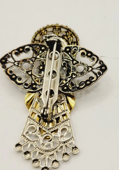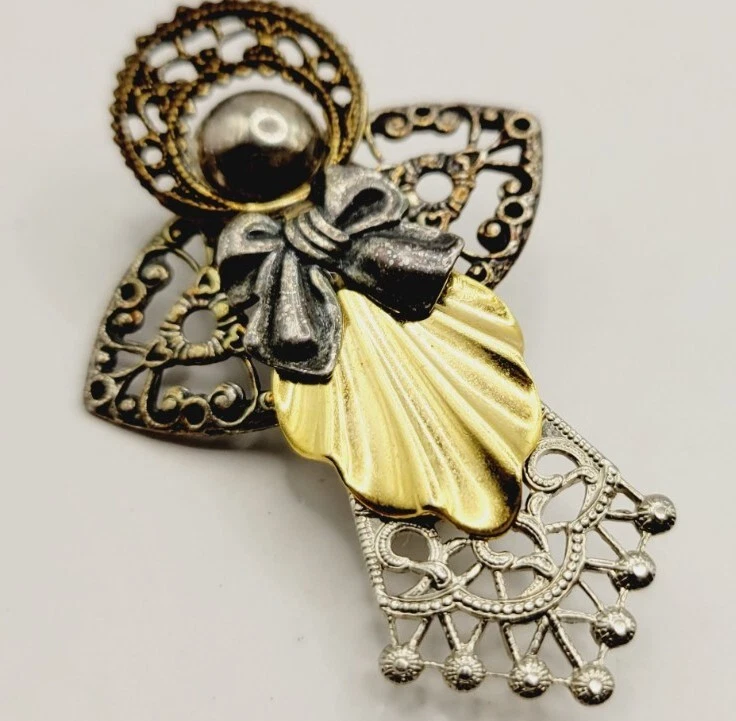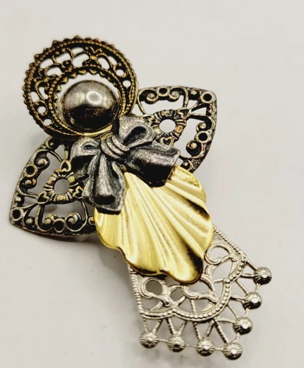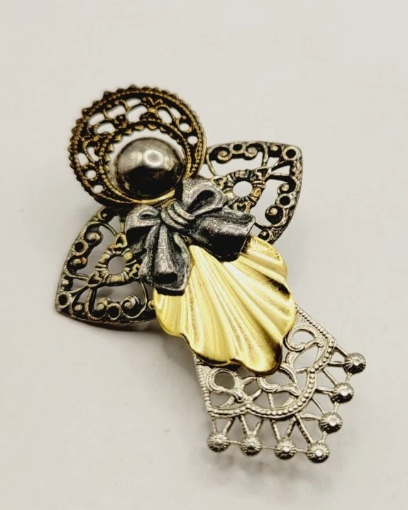 Vintage ANGEL Brooch Victorian Filigree Textured two tone Gold & Silver