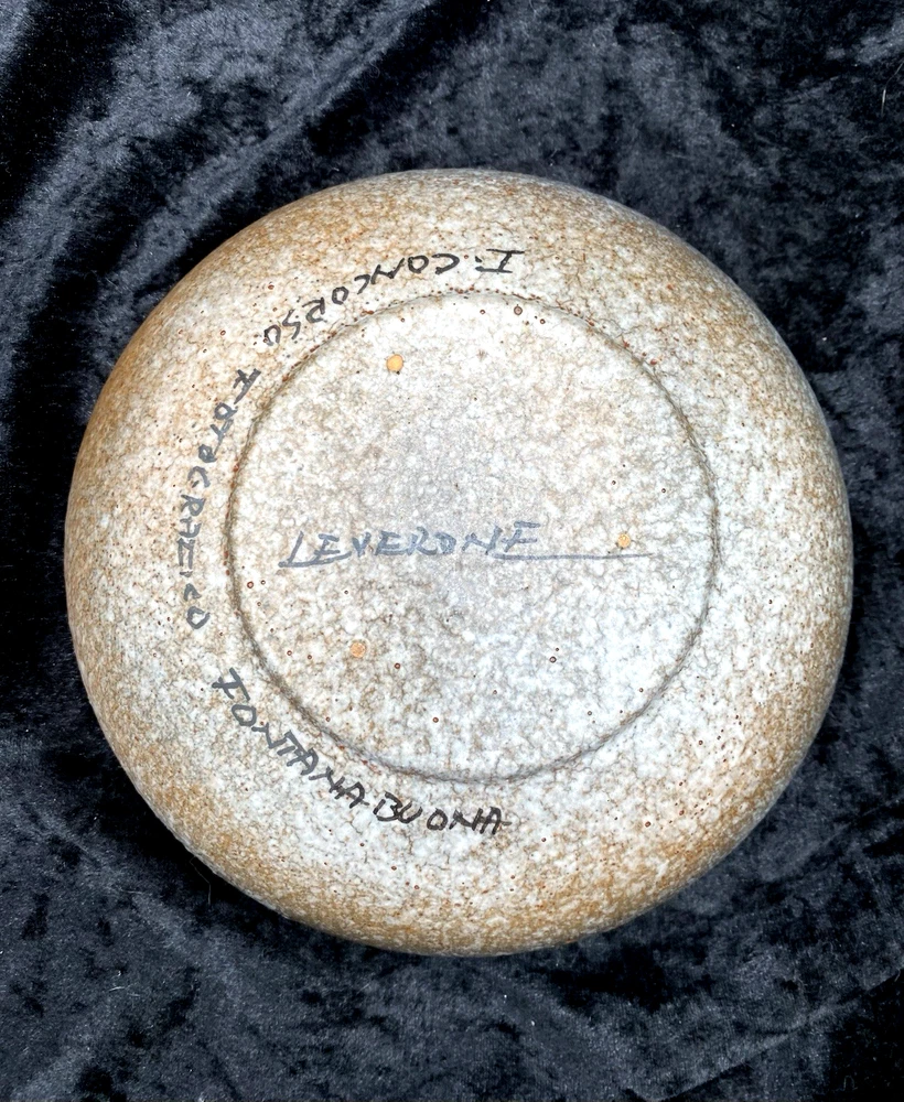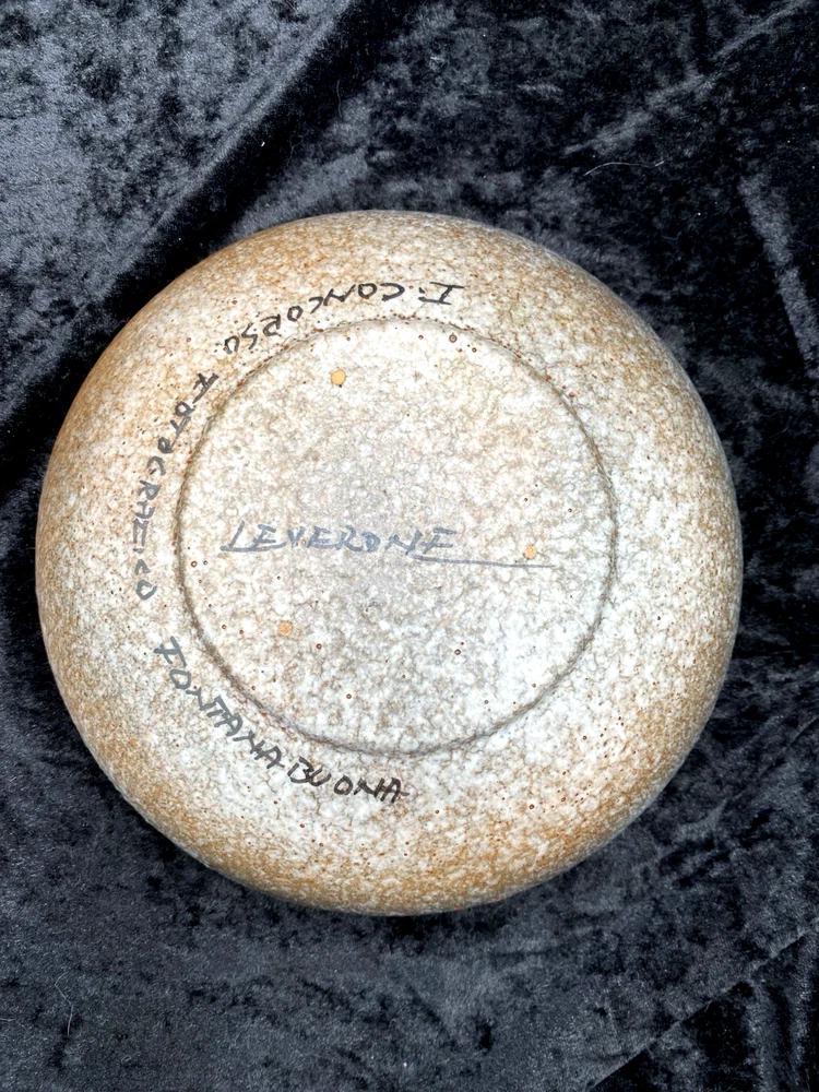 Embrace the essence of contemporary art with this vintage Adriano Leverone ceramic bowl, a true testament to Italian craftsmanship. Inscribed by the artist, it states, "1st Photographic Competition of Fontanabuona." This is a small town on the border of Liguria and Tuscany, near Genoa. As Mr. Leverone taught in Genoa in the 1990s, I believe the bowl comes from that time period. It stands as a unique, one-of-a-kind creation, complete with the artist's signature, adding an authentic touch to its already striking presence. The medium-sized bowl measures 8.25 inches in width and 2.3 inches in height, making it a substantial yet versatile piece for any collection. From Galleria Gagliari : Adriano Leverone (1953-2022) is an undisputed master of ceramics. Indeed, it is this technical expertise combined with his constant exploration of the medium and a formal equilibrium which synthesizes to produce work of extraordinary beauty and illusionary lightness. After his diploma from the Istituto Statale d’Arte in Chiavari, he enrolled at the art teachers’ training college G. Ballardini Ceramics Art Institute in Faenza in 1971. Between 1973 and 1974, Leverone studied at Carlo Zauli’s studio. He began exhibiting his work during this period at personal and collective exhibitions. In 1975, he opened his first personal studio for ceramic work. Between 1983 and 1985, the artist was part of the A Tempo e a Fuoco Art Movement led by Vittorio Fagone. During the subsequent years he dedicated himself to teaching: from 1979 to 1986 at the Albisola Ceramic School and in 1994 at the Centro Italiano Femminile based in Genoa. He also taught a ceramic sculpture class at Berea College Crafts (KY., USA). On behalf of the Ministry for Foreign Affairs, he spent time in Ethiopia from 1987 to 1989 and in Brazil in 1992, taking part in a programme to train technicians and to set up a ceramics school as an expert in working with terracotta. In the following years he created various works for public bodies in stoneware, slate, and bronze. Leverone was also invited to take part in art exhibitions and international symposia. During his artistic career he was awarded numerous honours and credits. His works are exhibited in many private and public collections both in Italy and abroad.