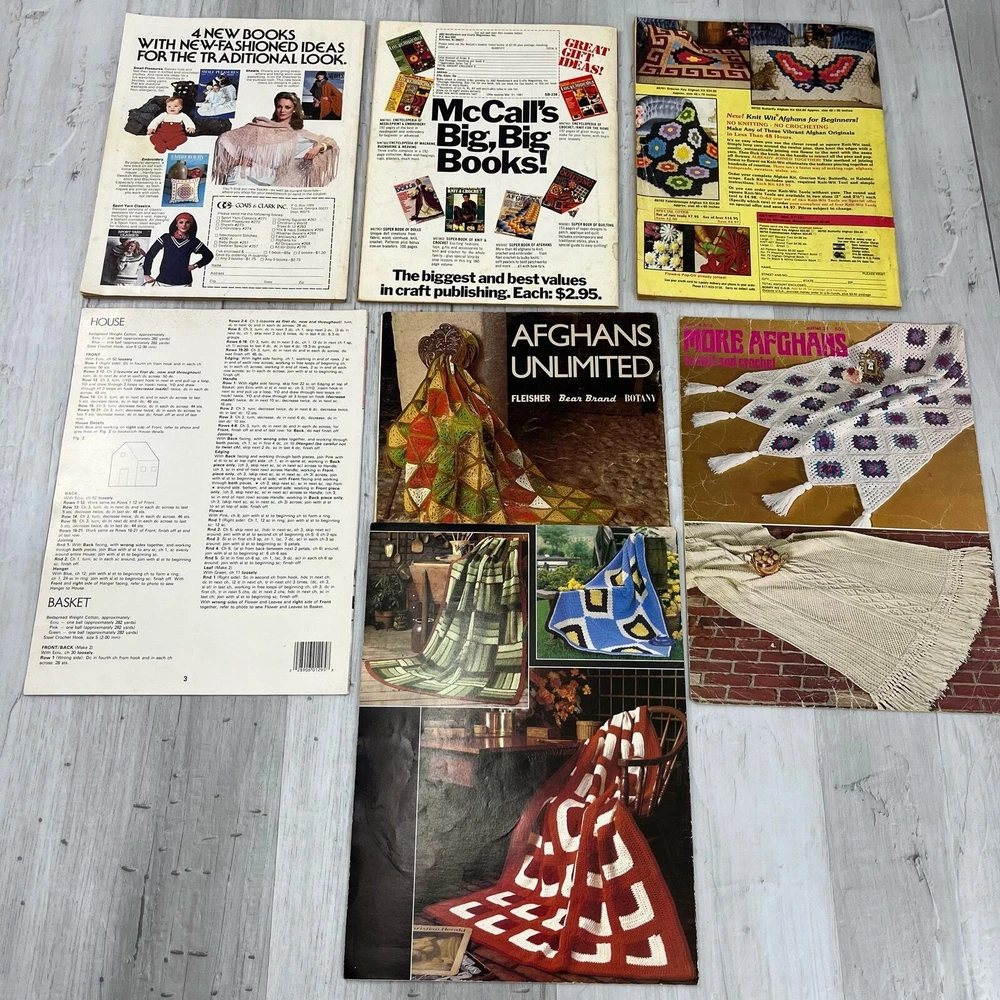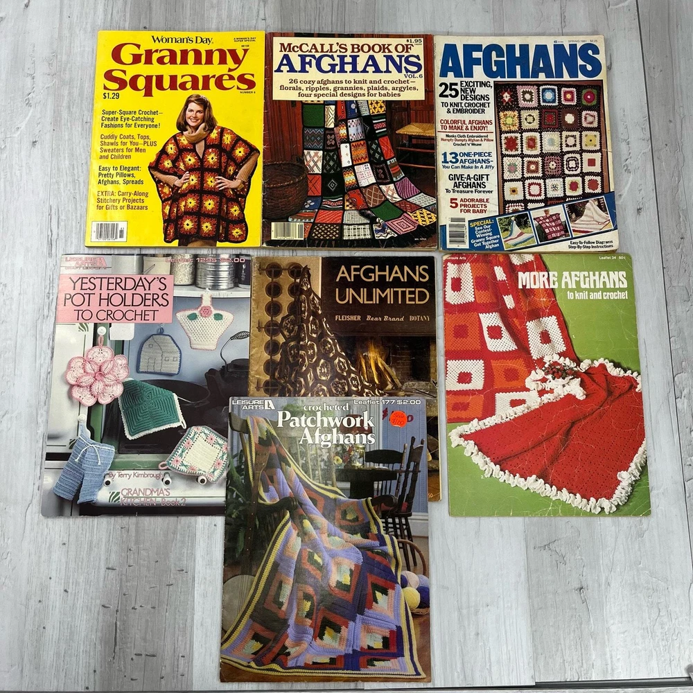 Vintage Afghan Granny Square Patchwork Crochet Pot Holders Magazine Lot Of 7 Woman's Day Granny Squares 1978 McCall's Book Of Afghans Volume 6 1980 Afghans Magazine Spring 1981 Afghans Unlimited Volume 65 1971 Leisure Arts More Afghans To Knit And Crochet Leaflet 34 Leisure Arts Crocheted Patchwork Afghans Leaflet 177 1980 Leisure Arts Yesterday's Pot Holder's To Crochet Grandma's Kitchen Book 2 All have some staining which can be seen in pictures Measurements available upon request Colors may differ based on others computer/phone/etc settings All pre owned items have been washed and steamed All pre owned items have been looked over for flaws and will be noted in listing