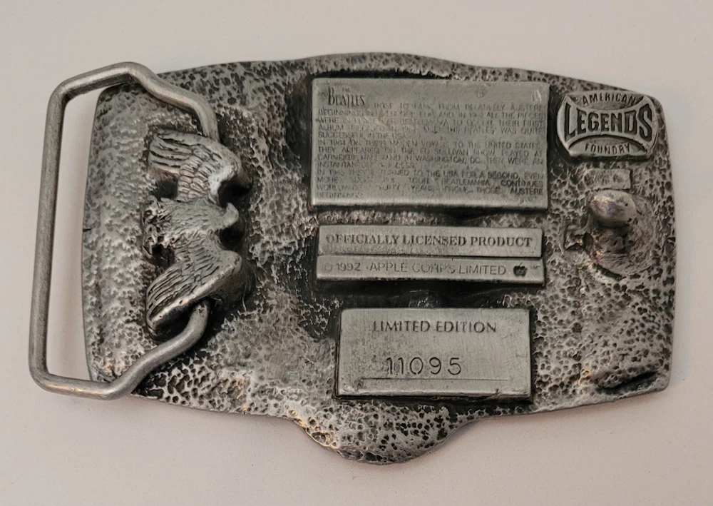 Made of pewter with red and blue enamel inlays Limited Edition, made in 1992 Serial number 11095 Measurements: 3.25"w x 2.35"h; belt width approximately 1.85" Has engraved brief history of The Beatles on the back, as shown in photos Does not include original packaging, comes shown as is Shipping Details: All items will be shipped UPS/USPS. Shipping & handling is specified for all items sold on Ebay, and includes insurance. This shipping charge is NOT VALID for International Orders, Puerto Rico, Hawaii or Alaska; please contact us via email and we will let you know what your shipping costs are. Buyer pays fixed shipping costs. Please email with any questions prior to bidding. We do combine shipping on multiple items; a combined invoice will be sent via ebay prior to payment. International customers, please note that import duties, taxes and/or charges are not included in the price of the item or shipping charges. These charges, if any, are the buyer’s responsibility. Please check with your country’s customs office to determine what these additional costs may be prior to purchasing. Please note: there is no tracking information with USPS first class mail, for either international or local shipments. Delivery via first class is at your own risk; buyer assumes all responsibility for lost packages. See description for additional comments.