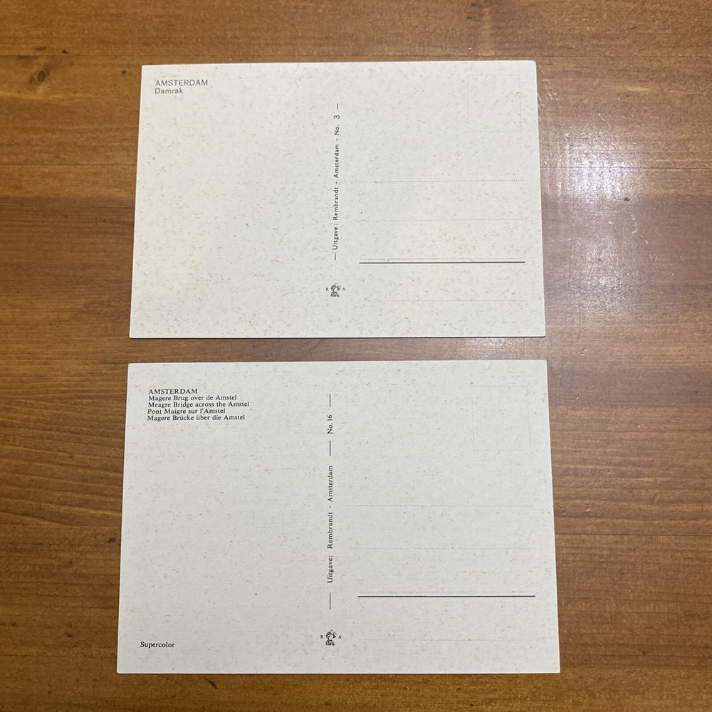 The product is a set of two original Real Photo postcards featuring Amsterdam. Each postcard is Continental-sized (6 x 4 in) with a divided back. They are unposted and from Rembrandt Amsterdam. The images capture the city's topographical views, suitable for any occasion. The postcards are from Argentina and showcase Amsterdam's cityscapes.