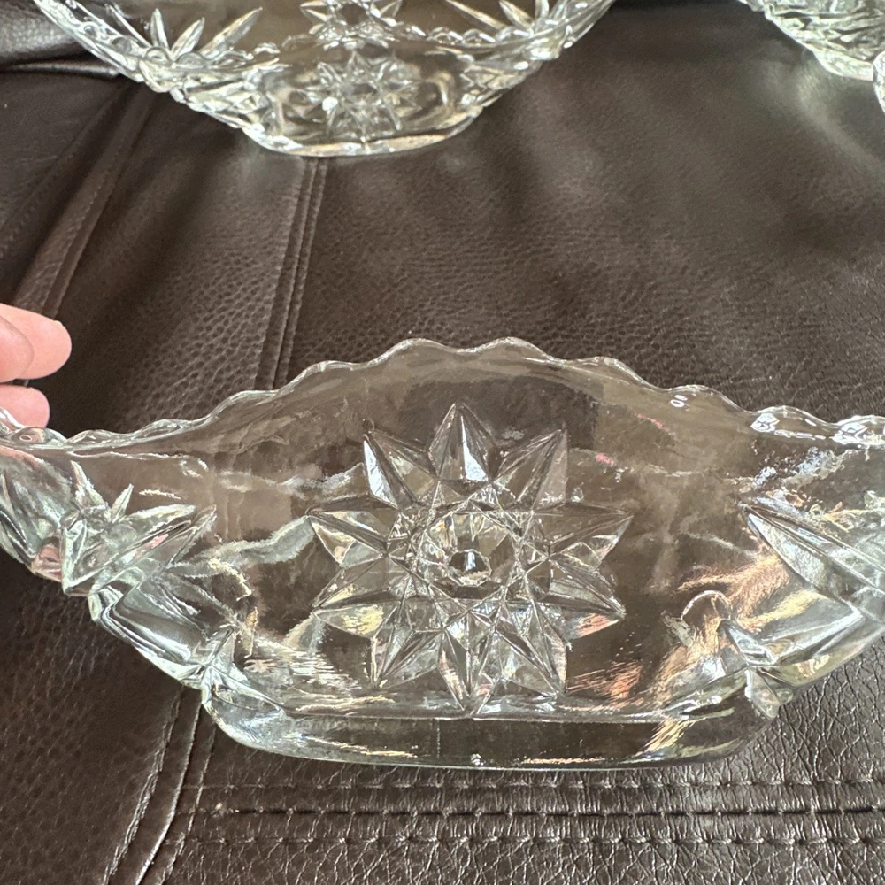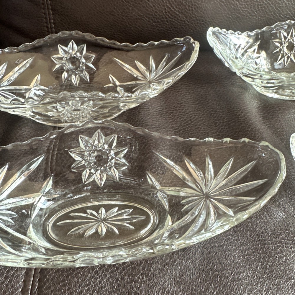 This product is a set of four vintage Anchor Hocking glass banana boats, each measuring 9.5" x 4.25". The glasses are clear and made of glass, and they belong to the Early American Prescut/EAPC product line. They are also vintage items. The brand of the glasses is Anchor Hocking, and the number of items in the set is four. Beautiful used condition!