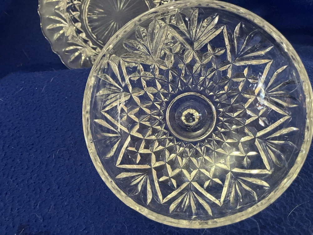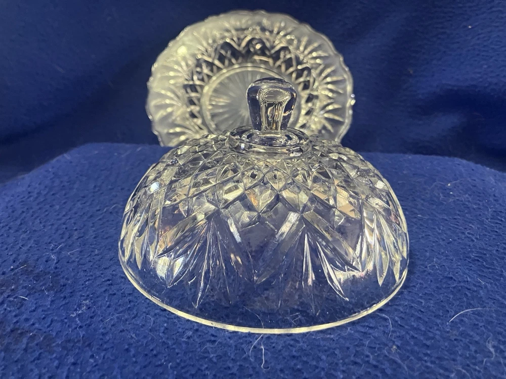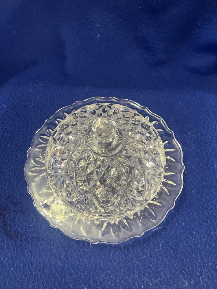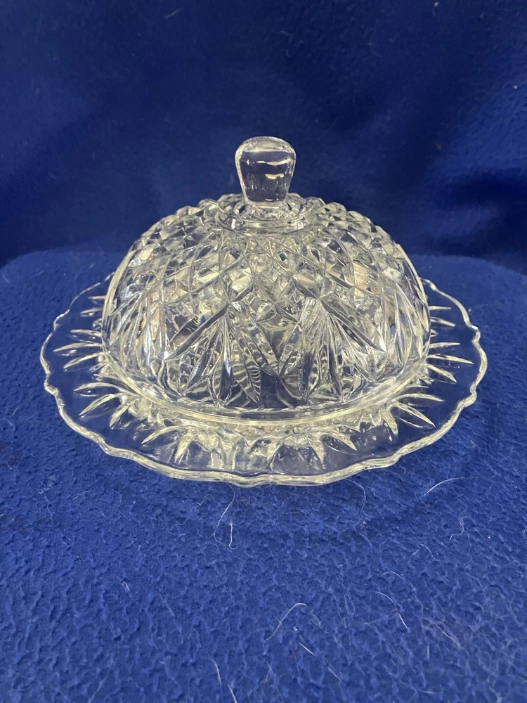 Enhance your collection with this exquisite Prescott Clear by Anchor Hocking round mid-century covered butter/cheese dish. Boasting the iconic Prescut clear starburst pattern, this pressed glass vintage glassware combines beauty and functionality. Measuring approximately 4 1/2 inches in height and 6 7/8 inches in width, its scalloped edge base and dome-like lid make it a stunning centerpiece for any table. Likely produced in the 1960 of 1970s. Perfect for serving or as a decorative item, this piece adds a touch of mid-century charm to your home. Embrace the timeless beauty of Anchor Hocking's Prescut Clear collection!