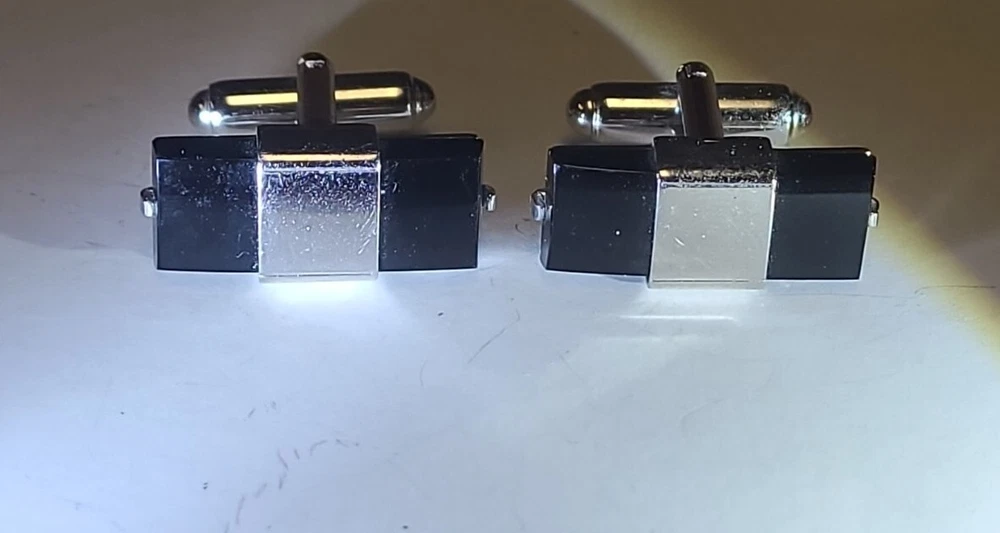 Vintage Anson Black Onyx Cufflinks marked Rectangle 3/4" Silvertone