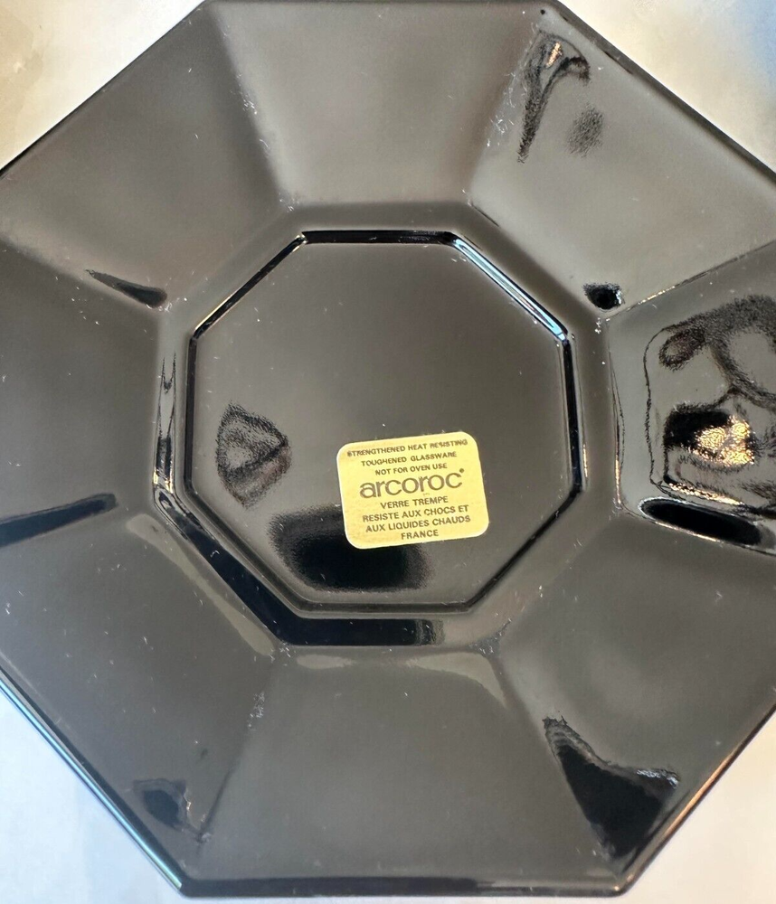Enhance your dinnerware collection with these elegant Arcoroc Dishes from France. The six-piece set features an octagonal shape with eight sides, each adorned with a unique pattern. The black pressed glass material adds a touch of sophistication to any occasion, whether it's a formal dinner or a casual gathering. Crafted with care, these butter pats are an original production style from France and boast an impressive backstamp. The glossy finish and geometric shape make them a perfect addition to any plate, while the antique design adds a touch of nostalgia. Ideal for all occasions, these Arcoroc Dishes are a must-have for any glassware enthusiast. Vintage Pre-owned Great Condition-No Chips or Cracks-Pictures are part of the description. Please view all pictures and contact me if you have questions. Visit my Store for other Great Finds and when you find multiple items you desire to purchase, I will combine your shipments (if possible) to save you money. Thank you for Your Business,