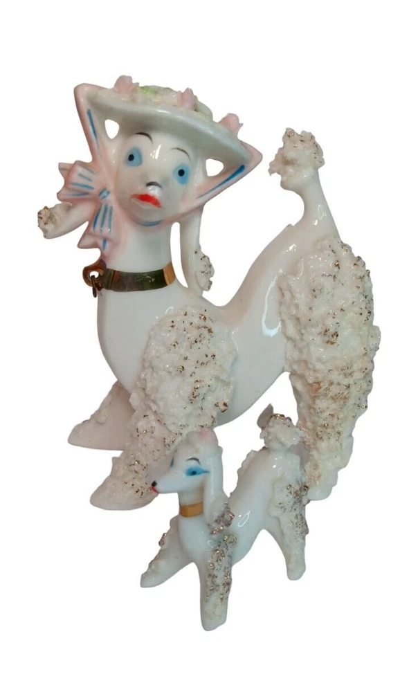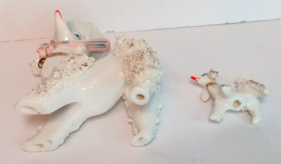 This adorable set of Japan made vintage figurines measures 5" in height and 4" in length (the mom) and the smaller one measures 2" in height and 2" in length. It does not have the chain that connect them. Please see all photographs as they are part of the description. Shipped with USPS Ground Mail.