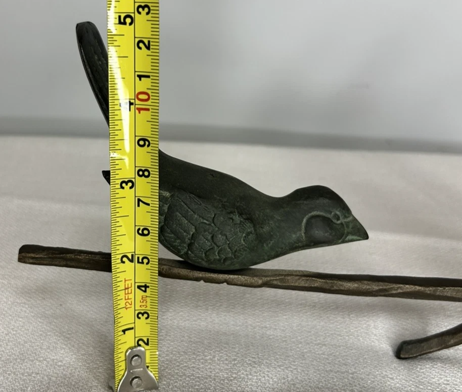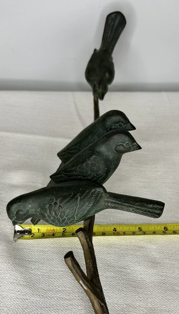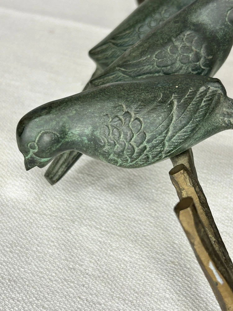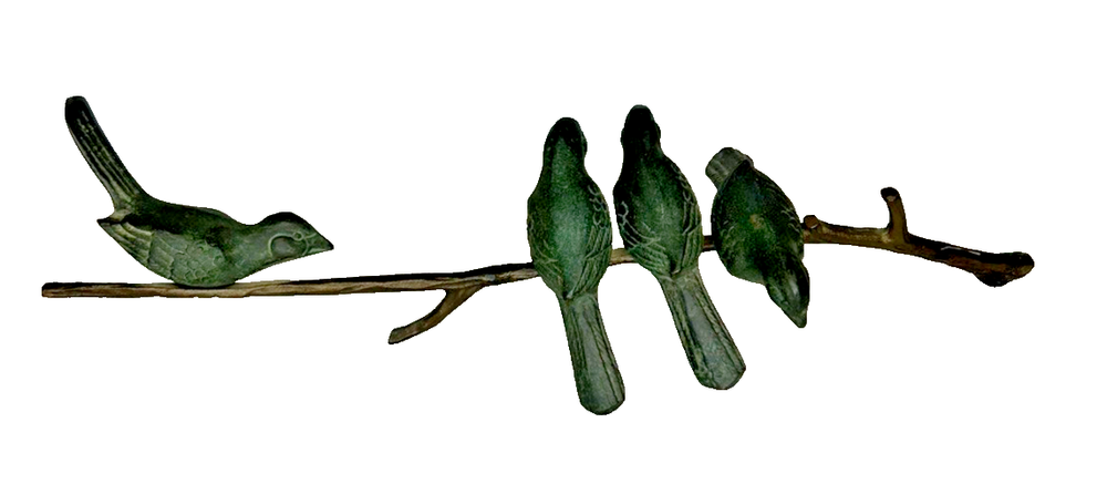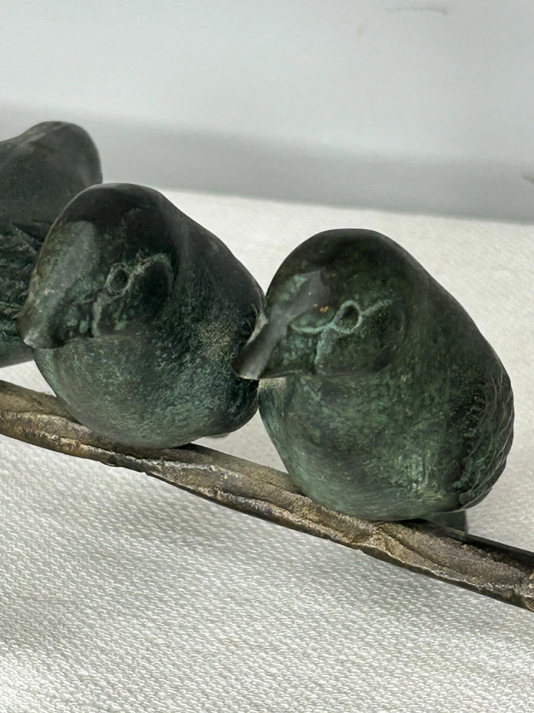This vintage Art Deco bronze sculpture features four birds perched on a branch, with a length of 18 inches. The medium-sized sculpture is an original piece from the 1925-1949 time period, showcasing intricate details and artistic style typical of the Art Deco movement. Made of bronze, this sculpture is a unique and elegant addition to any art collection, capturing the beauty and grace of nature with a touch of historical charm. Vintage Art Deco Bronze Sculpture Four Birds On A Branch 18" Long is in excellent vintage pre-owned condition. Please review all pictures for proper assessment of its excellent vintage pre-owned condition.