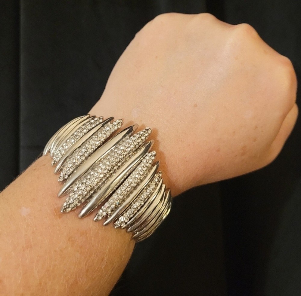 This vintage Art Deco cuff bracelet exudes glamour and sophistication. The fierce white crystal centerpiece adds a touch of elegance to any outfit, making it perfect for special occasions such as birthdays or Christmas. The round, colorless crystal is complemented by the shimmering silver metal, making this bracelet a must-have for any vintage jewelry collector. The cuff style adds a modern twist to this classic piece, making it suitable for any wrist size. This bracelet is perfect for those who appreciate the beauty and craftsmanship of vintage jewelry. 2" Wide Adjustable Silver tone base metal / crystal