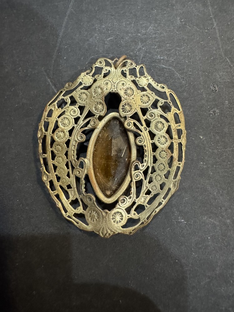 Vintage Art Deco Faux Glass Citrine Filigree Pendant Necklace