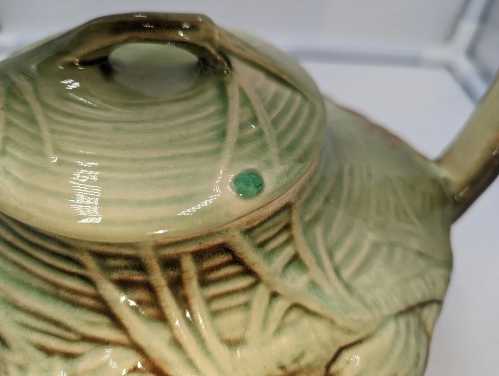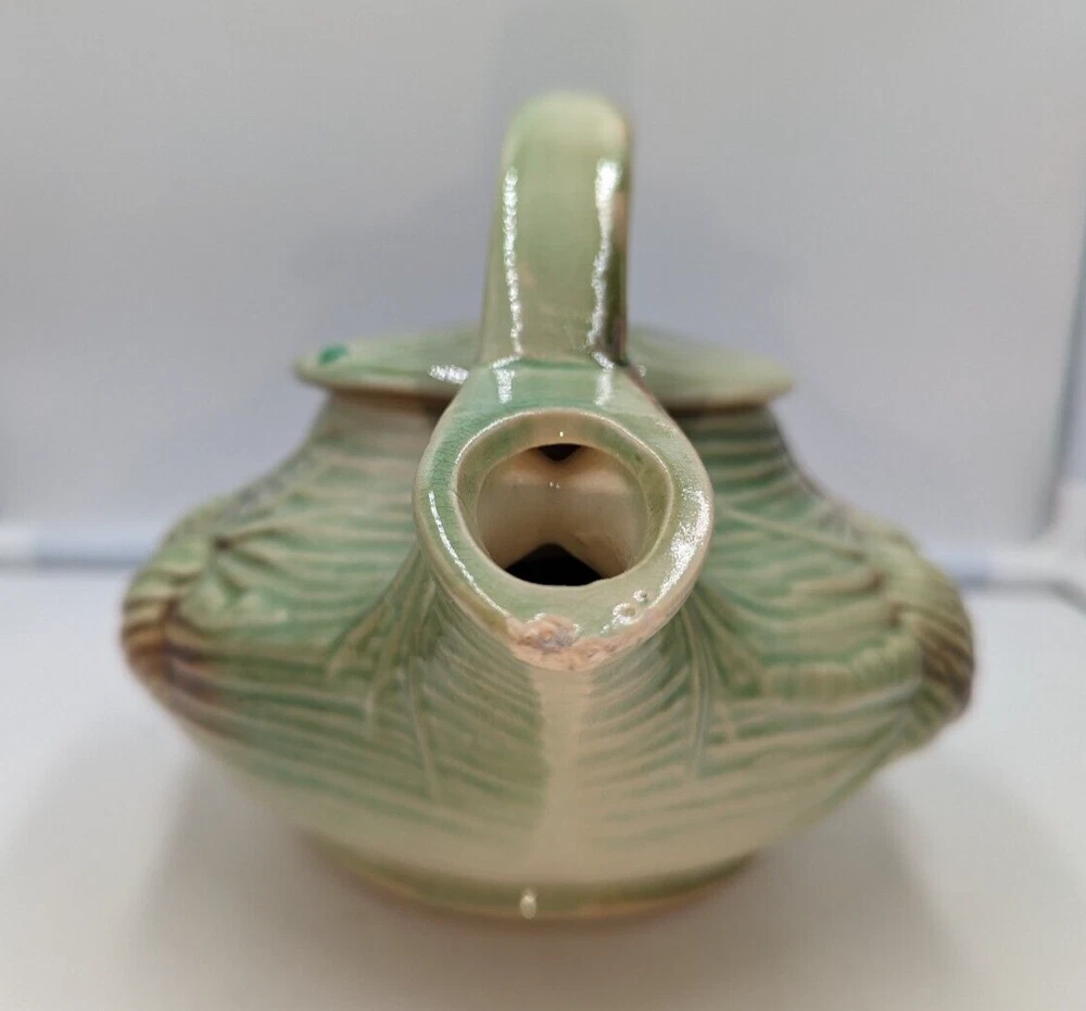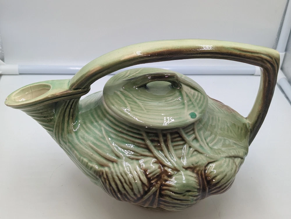 Vintage Art Deco McCoy Pottery Teapot 940s Pinecone & Branch w/Lid AS IS. There are a few condition issues - a couple of small chips on the spout and one small chip on the inside rim. Also there is glaze crazing on most of the teapot and a manufacturer defect - a small glob of green glaze on top of the lid. This would really still make a delightful addition to your teapot collection. All of my items are carefully packed for shipping, no matter their value - $5 items are wrapped with the same care as a $200 item. My goal is to have your purchase arrive safely. I use recycled packaging when possible but mostly use new, high quality products so your item will arrive intact without damage. Large, heavy and fragile items are harder to use combined shipping with but just ask if you would like to purchase more than one item and I am more than happy to do so if feasible. If not, maybe we can work out a shipping discount. Thank you and hopefully you will visit my store again!