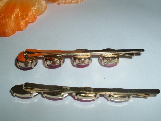 From a Chicago estate sale, 2 vintage, art deco bobby pins with prong set, red and pink rhinestones measuring 2" long. Condition is excellent, colors are awesome and lots of bling. We combine ship.