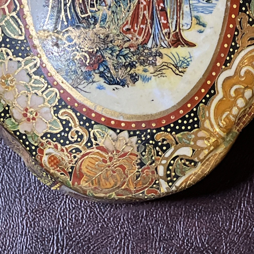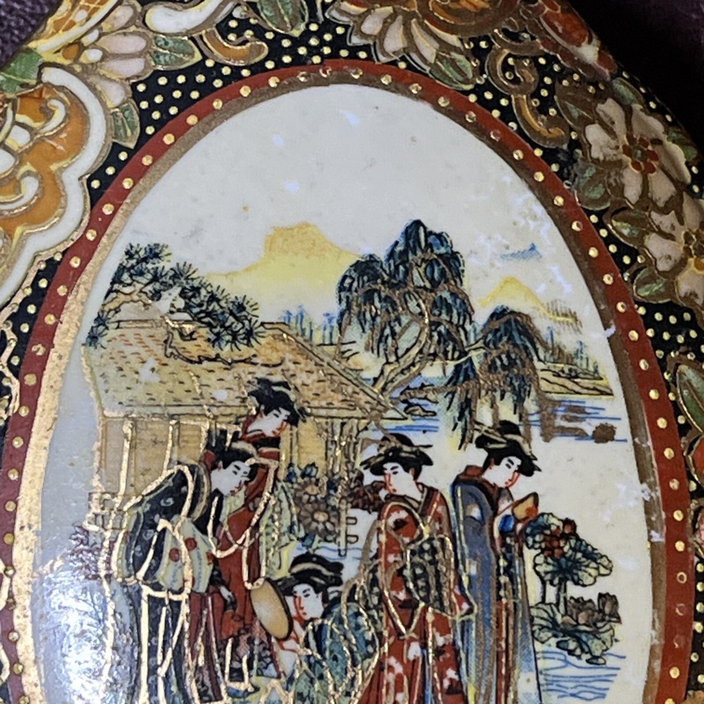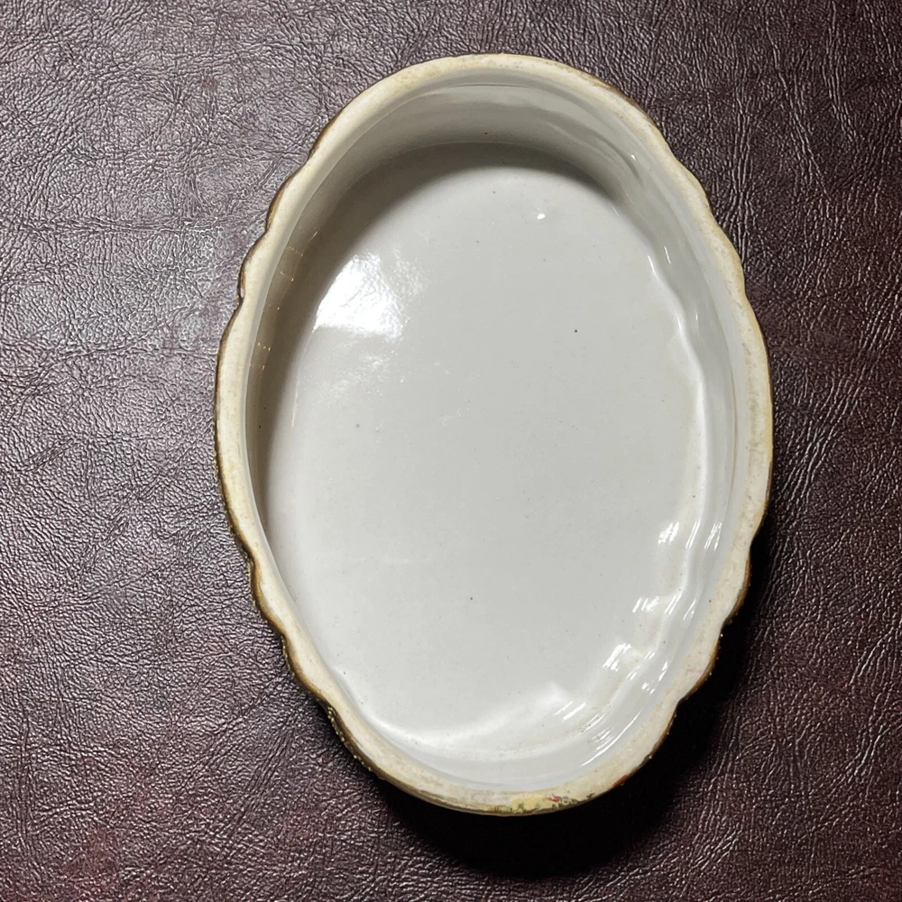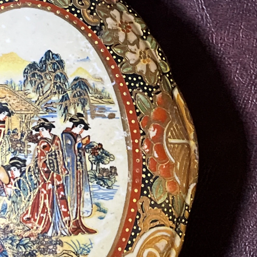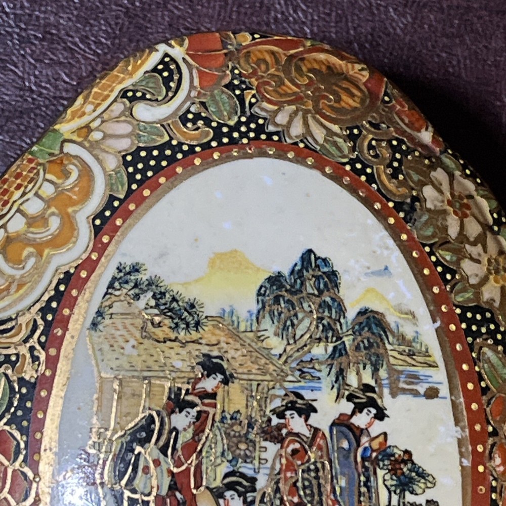 This vintage Asian ceramic jewelry box features a beautifully painted floral design with a Geisha motif, making it a charming decorative piece. The oval-shaped box with a lid provides storage for small trinkets and jewelry, perfect for all occasions. Made in China, this medium-sized trinket box showcases multicolor artwork in an Asian style, ideal for collectors and those who appreciate period styles.