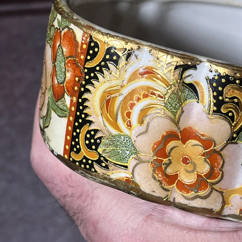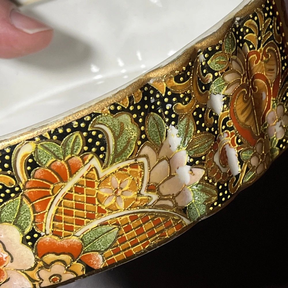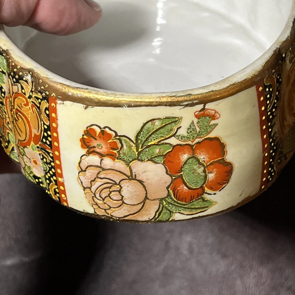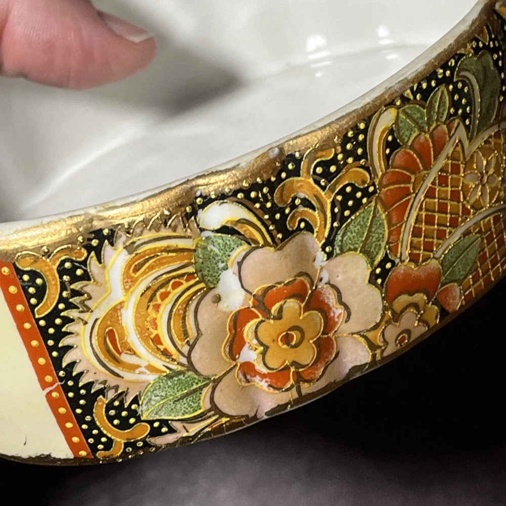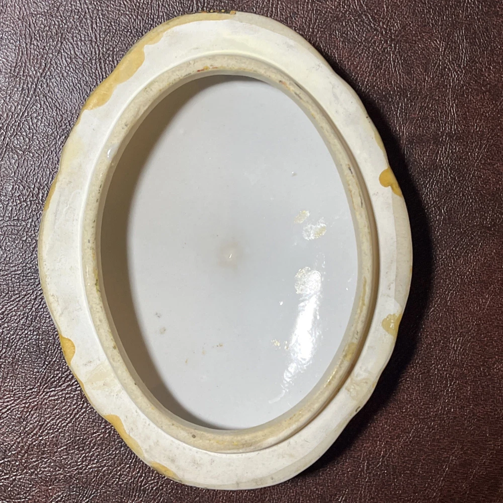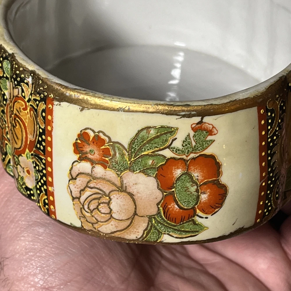 This vintage Asian ceramic jewelry box features a beautifully painted floral design with a Geisha motif, making it a charming decorative piece. The oval-shaped box with a lid provides storage for small trinkets and jewelry, perfect for all occasions. Made in China, this medium-sized trinket box showcases multicolor artwork in an Asian style, ideal for collectors and those who appreciate period styles.