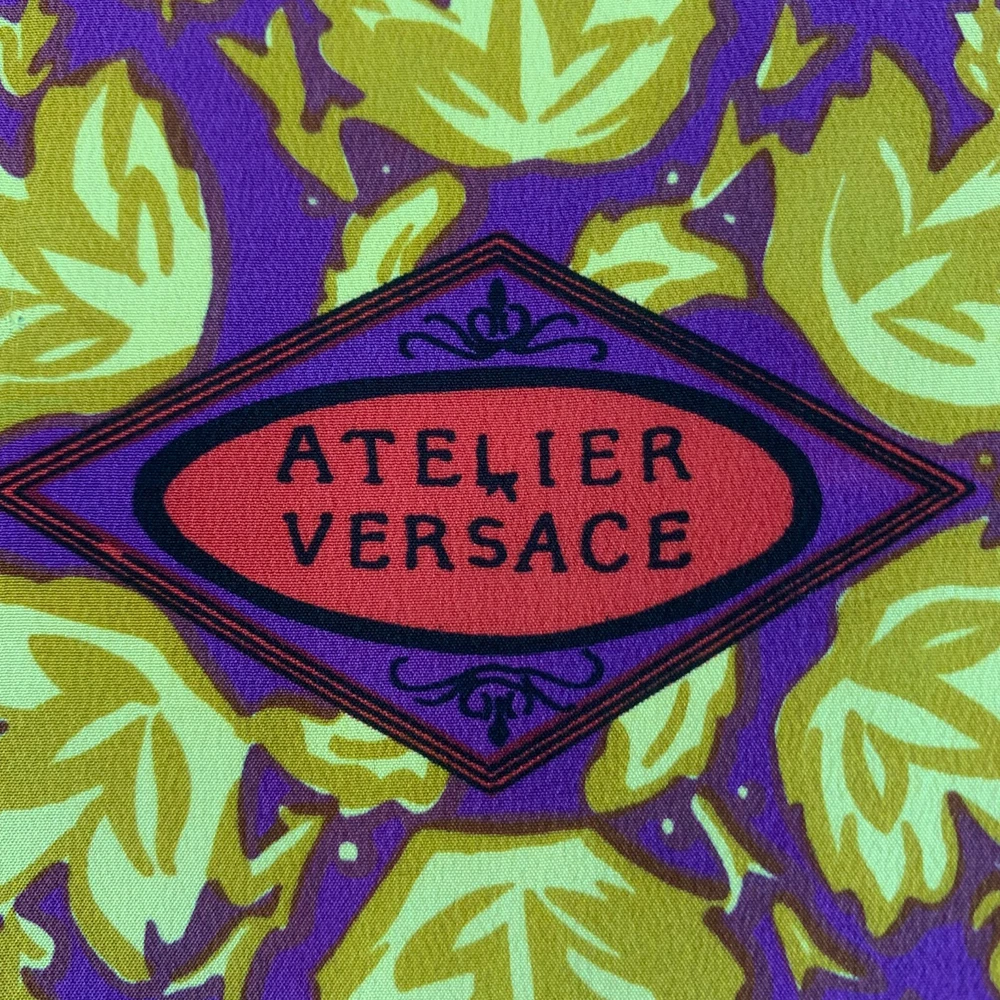Elevate your style with this vintage Atelier Versace silk scarf, a true testament to classic design and timeless elegance. Featuring a vibrant geometric pattern that captures the essence of the 80s and 90s art theme, this square foulard is as versatile as it is visually striking. The luxurious satin silk fabric ensures a sublime touch and a high-quality finish to any ensemble. Designed for both men and women, this scarf can be worn as a neck warmer, scarf, or even a stylish accessory to accentuate your handbag. Measuring 32 inches in length and 33.5 inches in width, it is perfect for all-season use. The iconic Versace logo adds an exclusive touch to this multifunctional piece, which should be dry-cleaned to maintain its beauty.