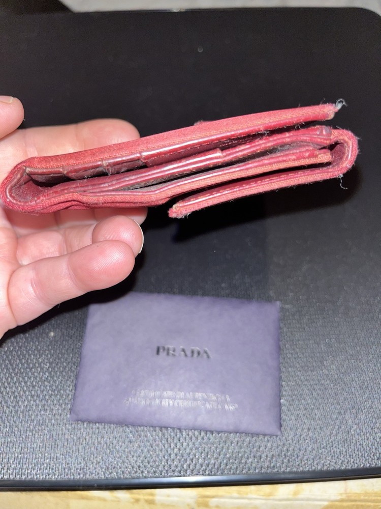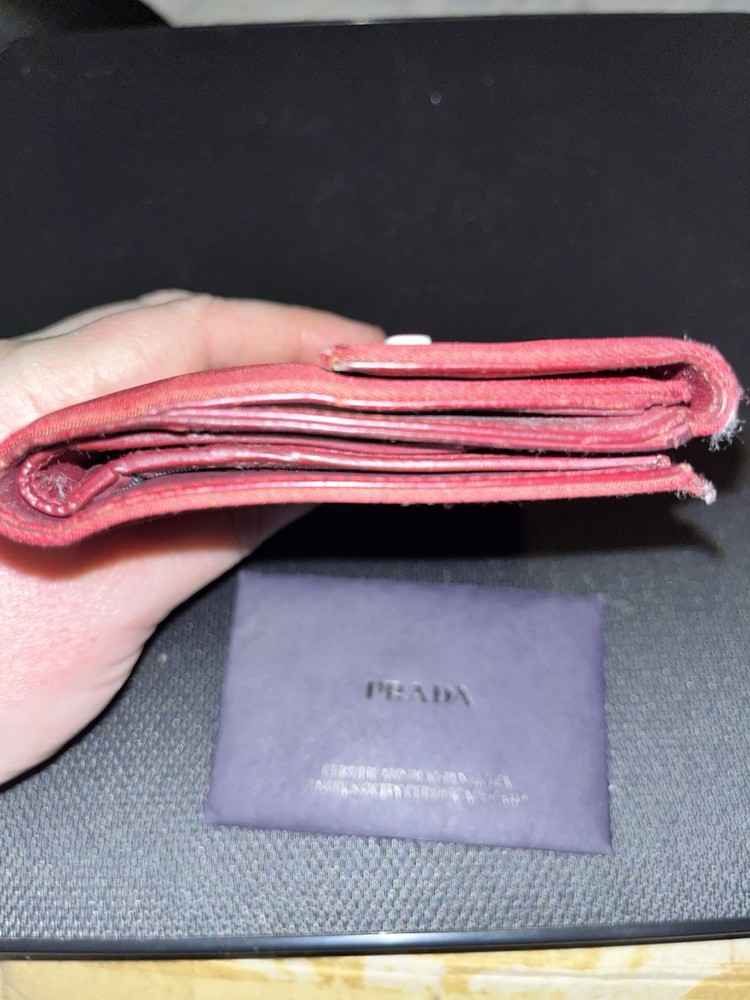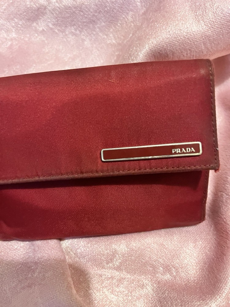 COA INCLUDED Elevate your style with this authentic vintage Prada wallet, a timeless accessory for the fashion-forward woman. Crafted in Italy from durable nylon material, this wallet boasts a classic cherry red hue that adds a pop of color to your everyday essentials. The solid pattern exudes a sense of sophistication, while the wallet's one-size-fits-all design ensures it's a perfect match for any handbag. The wallet features a practical folding design, complete with credit card slots to keep your financials organized. A certificate of authenticity is included to guarantee the wallet's genuine Prada heritage. Embrace the elegance of the 90s with this Prada wallet, a blend of function and high fashion.