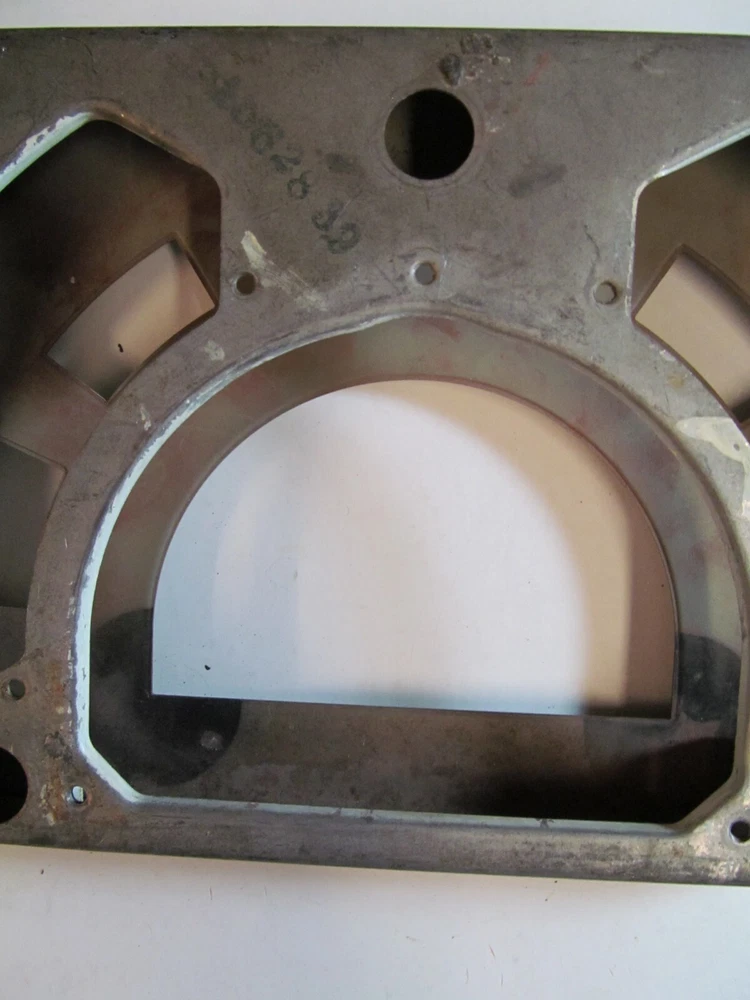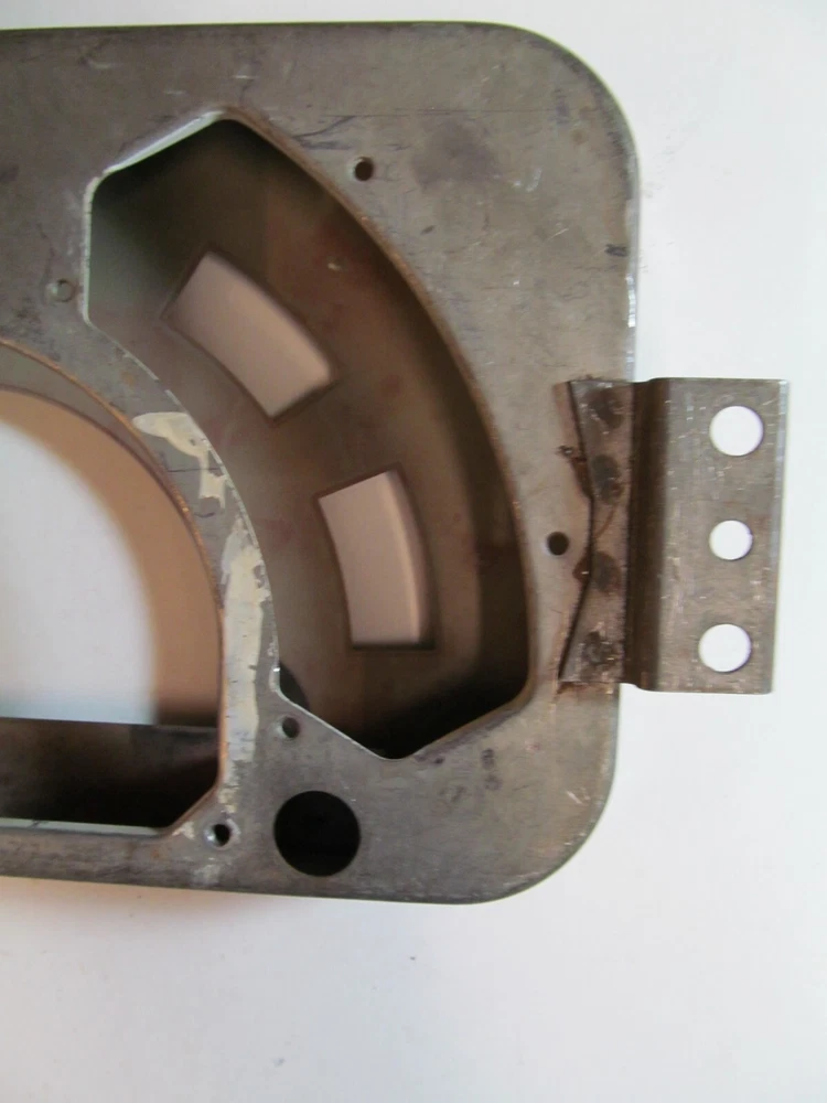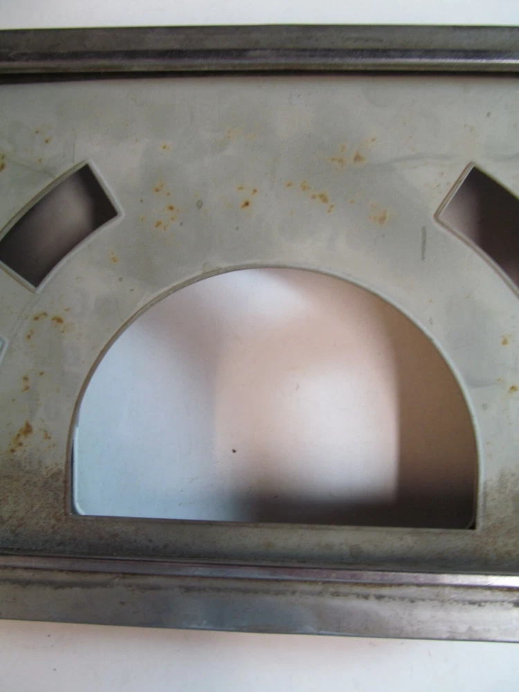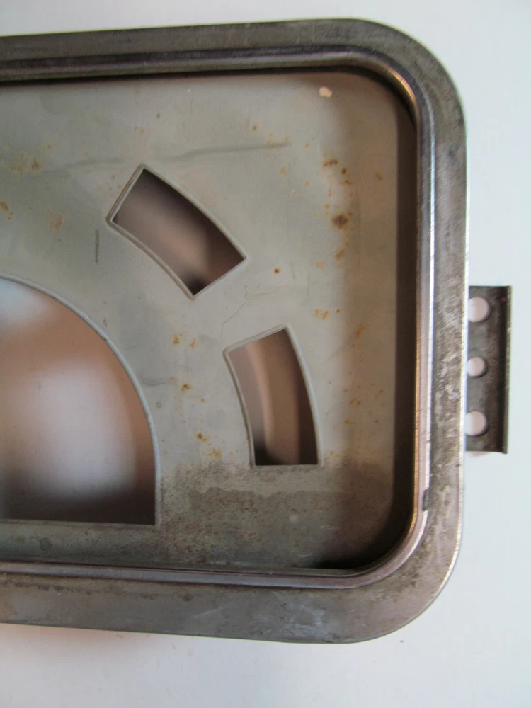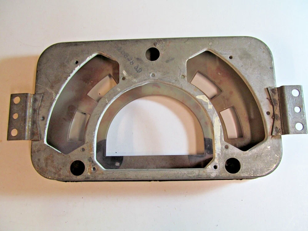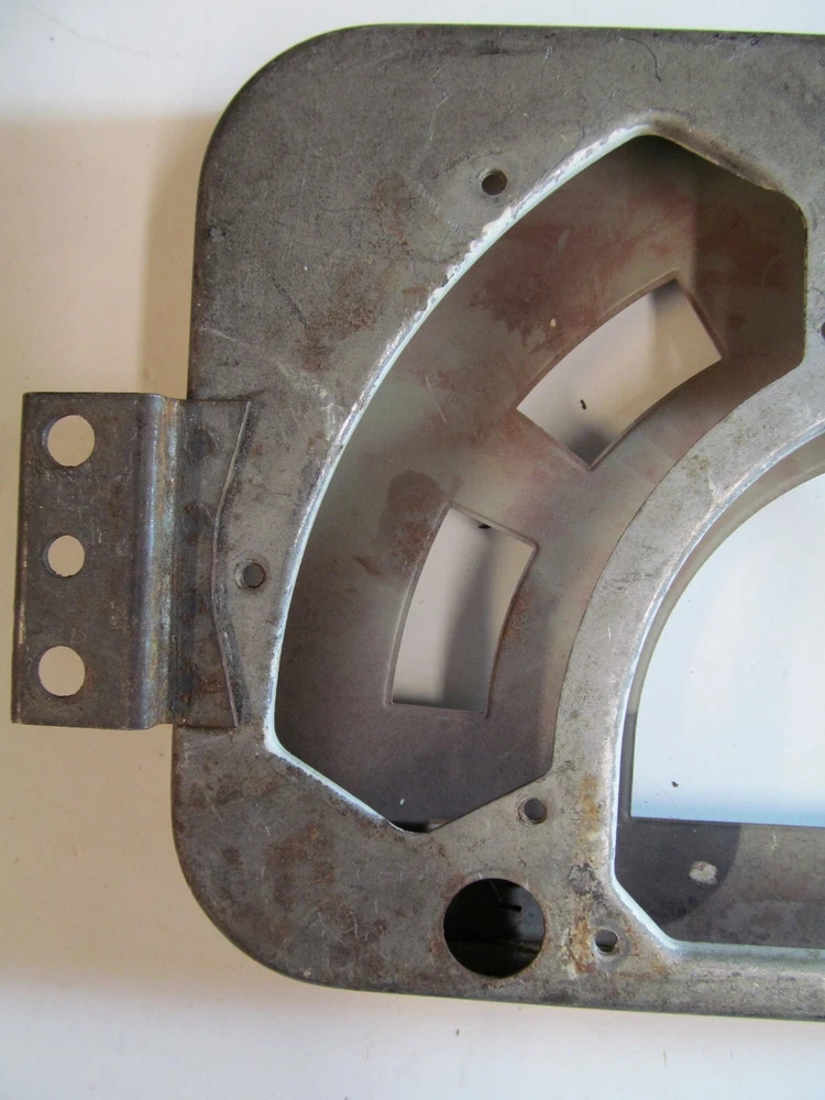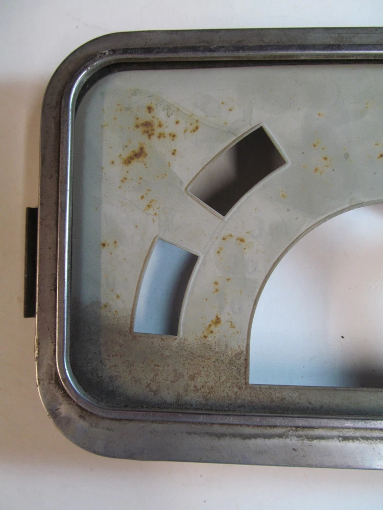 Gauge cluster frame. Make and model unknown. A search of images on the internet showed this frame is similar to a 1950 Chrysler's. 10 inches wide. 6-1/4 inches deep. 1-1/2 inches thick. This is a mystery gauge frame, possibly from the 1950 era. The chrome trim bezel is surface rusted. There is some surface rust on the frame body but overall the frame is in good condition. The mounting brackets on each side are rusty. Thank you!