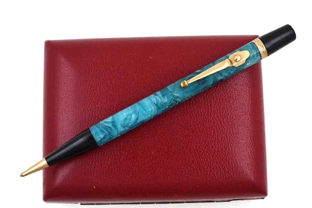 This is a beautiful vintage Autopoint pencil from a local estate. It measures 5 ¾ inches long. the barrel is 10-sided. Blue celluloid with white swirling. You can see through it when held to the light. The end pieces are back, and the trim is yellow gold filled. The pen has a name engraved on the barrel. Also, the black top cap is chipped with a piece missing. But you can replace it with another one from a commoner black pencil. I am not sure if it will work or not, so I will offer it as is. A very rare model, seldom seen in need of basic restoration. Buyer pays shipping, $4 in USA. Thank you.