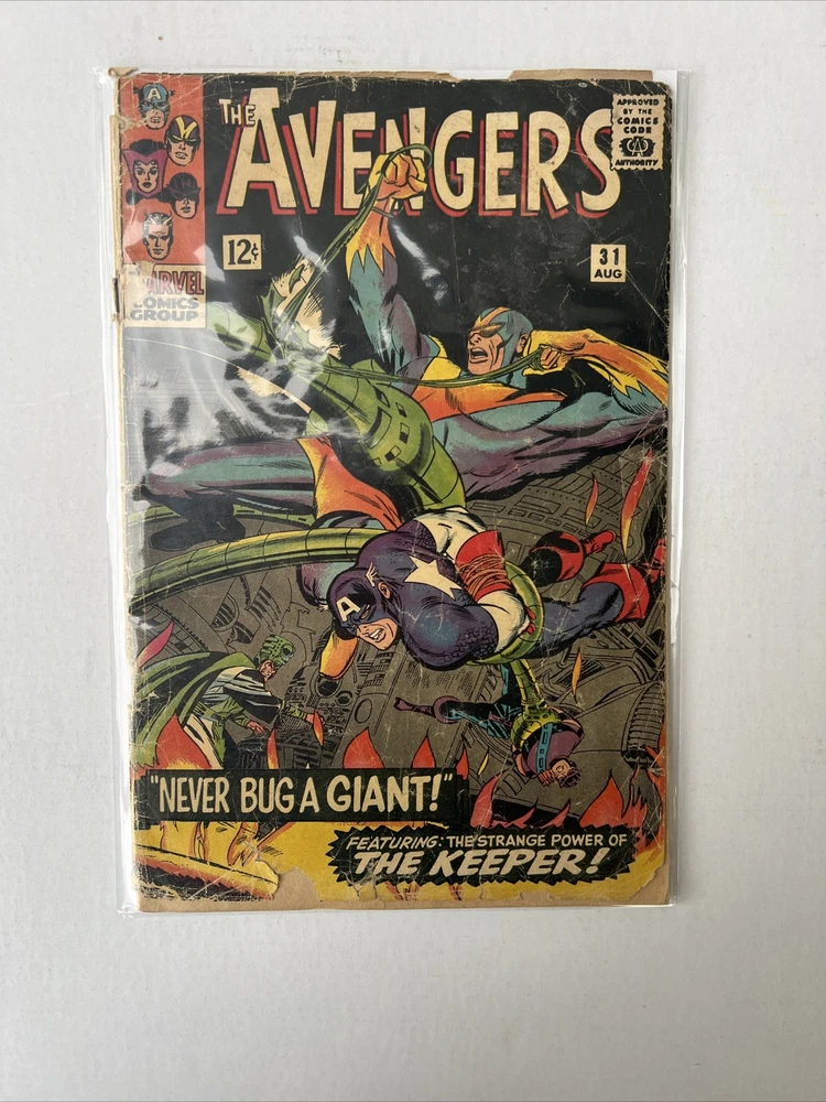 This is a rare and collectible comic book featuring the iconic superhero Captain America (Steve Rogers) in Avengers #31. Created by Stan Lee and Don Heck in 1966, this vintage piece is a part of the Marvel Universe and is a must-have for any comic book enthusiast. The issue number 31 is a part of the Avengers series title and falls under the Silver Age (1956-69) era of comics. The comic book is in a low grade condition and is a single issue format published by Marvel Comics. See pictures for condition on front cover and spine.
