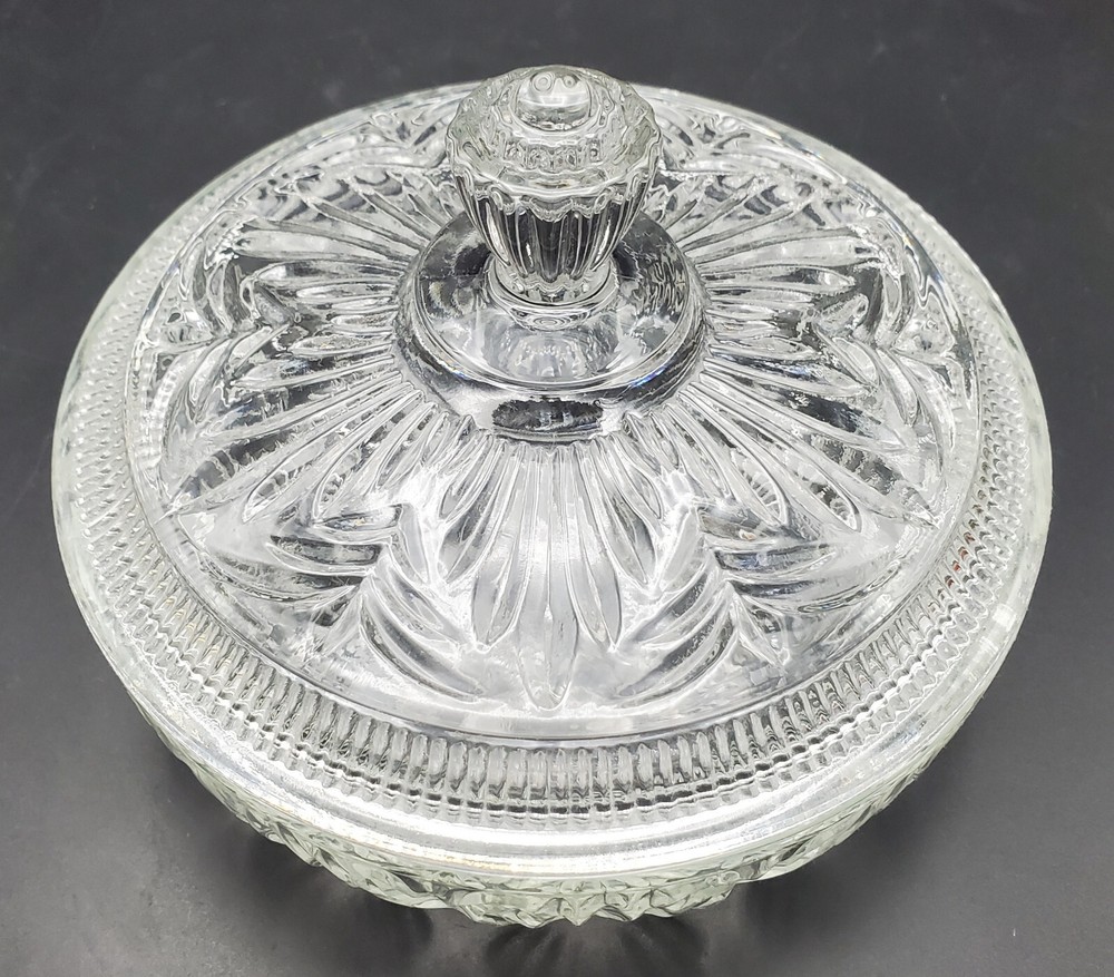 This Vintage Avon trinket candy dish is a clear cut glass bowl with lid, featuring a classic mid-century modern style. Made in the United States by Avon, this original piece is perfect for collecting decorative items. The lidded design adds a touch of elegance to any space, making it a versatile and charming addition to any collection. With its clear glass material and vintage appeal, this trinket dish is sure to be a standout piece in any décor.
