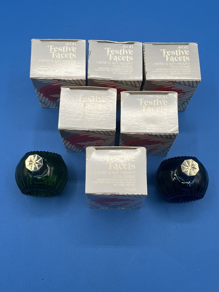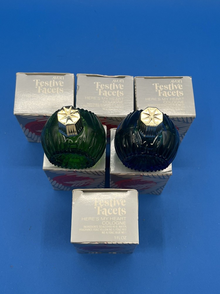 Lot of 6 Vtg Avon Festive Facets Cologne 1fl oz Ornament “Here’s My Heart”. 4 blue 2 green NOS IN BOXES