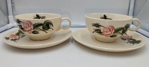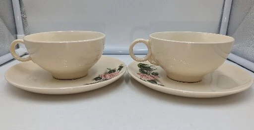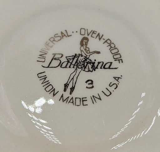 Vintage Ballerina Moss Rose Coffee Tea Cup & Saucer Set of 2 by Universal 1950's. Very nice pre-owned condition with no damage, not even a scratch. These cups and saucers are just adorable and very 1950's. The underside of the plate is stamped "Universal Oven Proof Union Made USA" with a picture of a ballerina and the word Ballerina printed over the figure. It looks like it is stamped in platinum. They look to be a 6-8 ounce cup. All of my items are carefully packed for shipping, no matter their value - $5 items are wrapped with the same care as a $200 item. My goal is to have your purchase arrive safely. I use recycled packaging when possible but mostly use new, high quality products so your item will arrive intact without damage. Large, heavy and fragile items are harder to use combined shipping with but just ask if you would like to purchase more than one item and I am more than happy to do so if feasible. If not, maybe we can work out a shipping discount. Thank you and hopefully you will visit my store again!