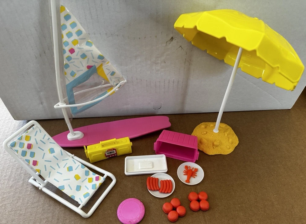 Some minor wear, see photos Frisbee has some wear and marks This vintage Barbie and Skipper Beach Party Playset #7332 by Mattel, manufactured in 1987, is a collector's dream. With several pieces, including both dolls, this original set is perfect for any occasion, especially parties. The set features outdoor adventure and requires adult assembly. The dolls are 11 inches in size and are gender-neutral. The packaging is not included, but the set is in great condition. This Barbie and Skipper set is perfect for anyone who loves Barbie and Skipper and wants to add to their collection.
