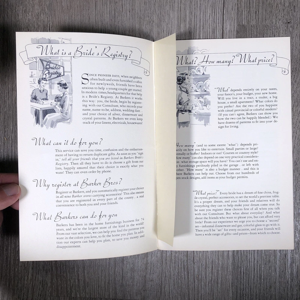 Vintage Barker Bros Bride Registry Booklet Stickers Bride’s Book Home Furnishings 1950s Southern California LA Los Angeles Orange County