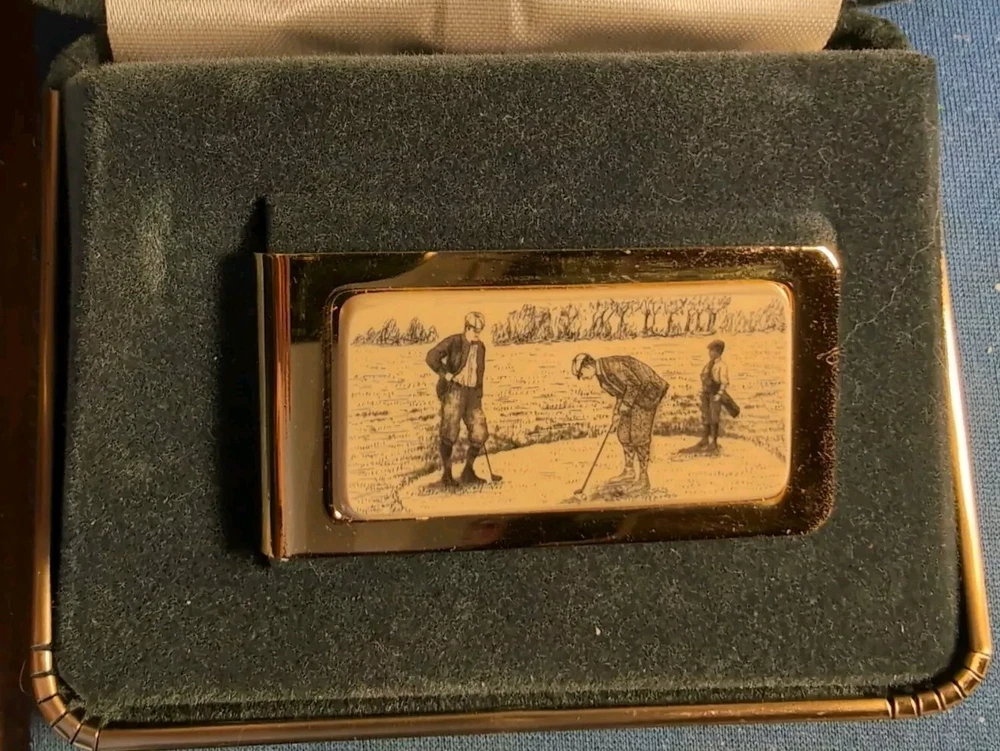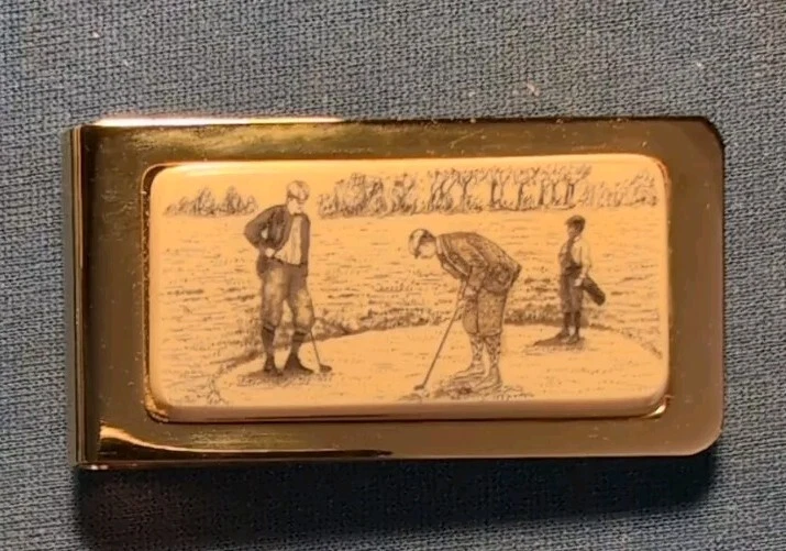This Vintage Barlow Gold-tone Money Clip features a faux scrimshaw design with golfers on green with caddy on a green. The slim fold clip is made of gold tone metal and measures 2" in length and 1" in width. It comes in a box case and carries a vintage aesthetic, perfect for golf enthusiasts. The money clip is accented with a logo and is a unique accessory for men who appreciate nature and golf themes. Made in the United States, this item is a stylish and functional addition to any man's accessories collection. See scans to help see the condition. Never used.