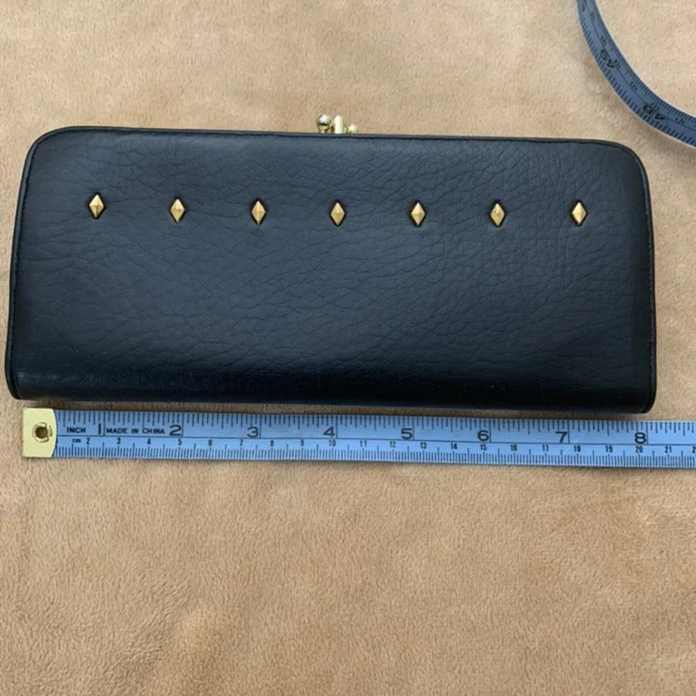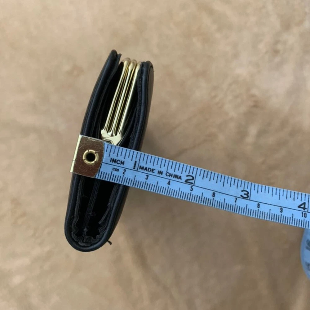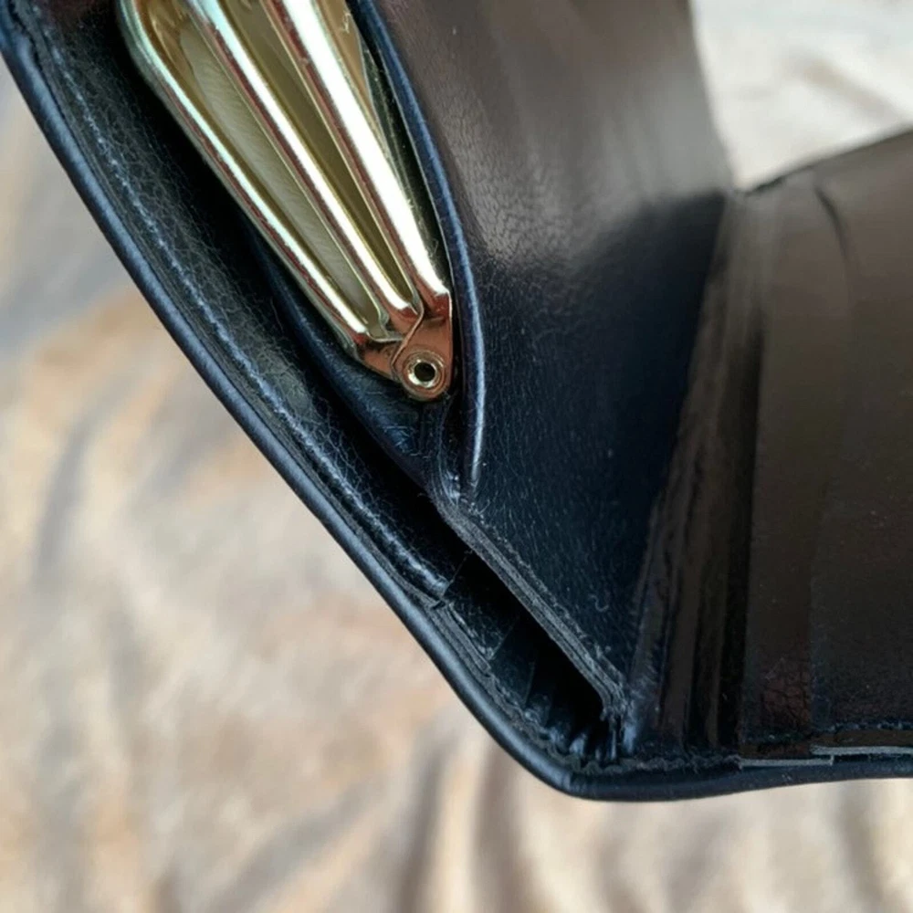Vintage Baronet Wallet Navy with brass clasps & diamond-shaped studs Double clasp center has clear plastic divider, 2 full-length slots on either side Exterior has no notable flaws, interior has wear at gold in the middle - see photos & feel free to contact me with questions