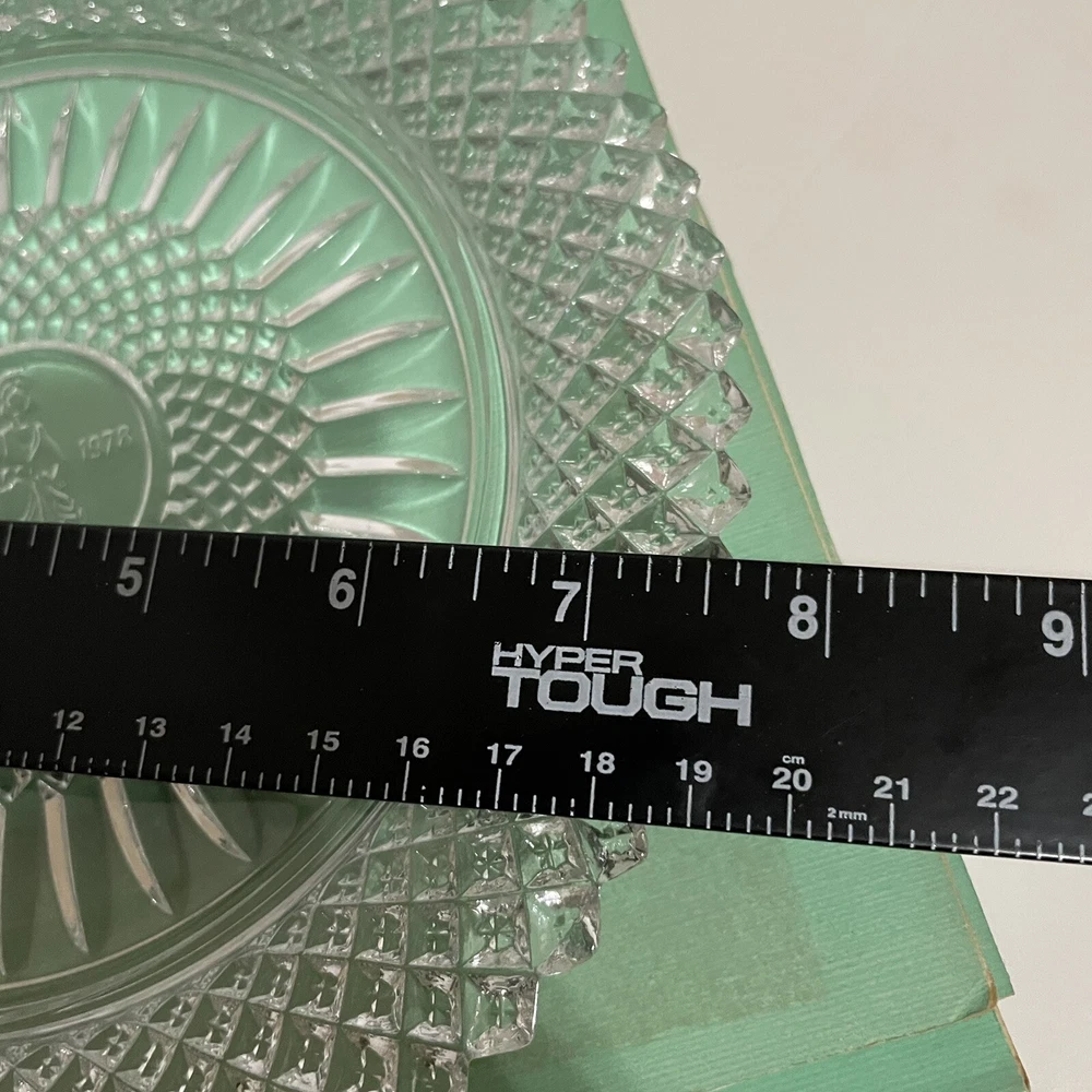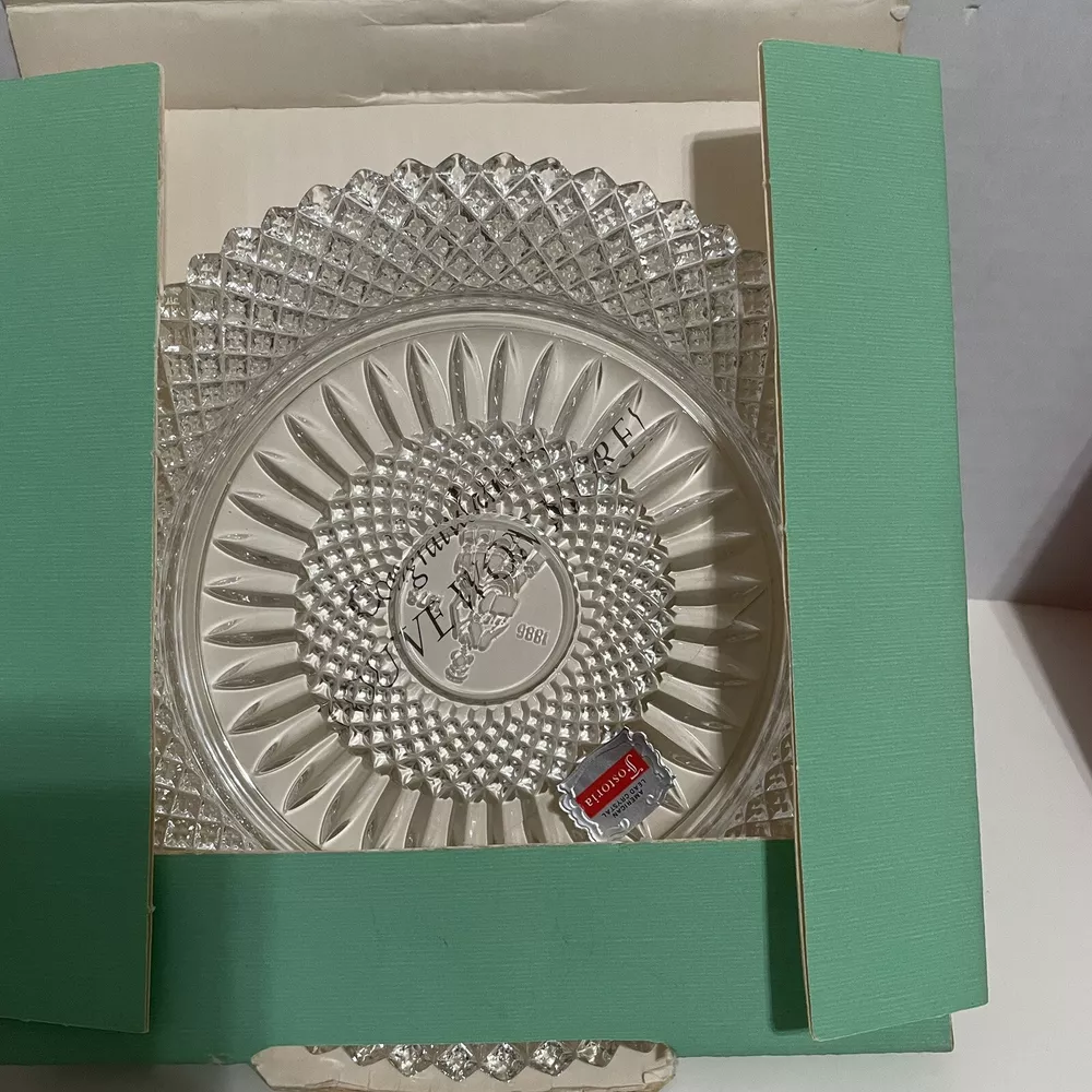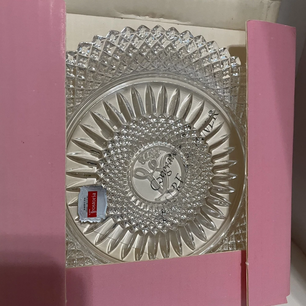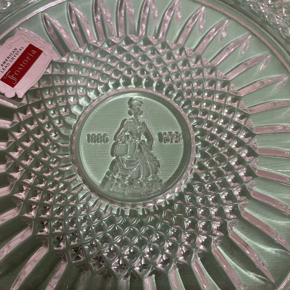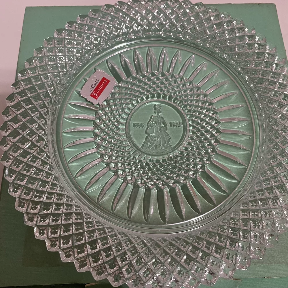 Vintage~ Beautiful 1978 Avon 92nd Anniv Set of 2 FOSTORIA LEAD CRYSTAL ~8"Plates The product is a set of two vintage 1978 Avon 92nd anniversary collector plates made by Fostoria from lead crystal glass. Each plate has a diameter of 8 inches and features an elegant glass production style. These round plates are considered antique and were manufactured in the United States. The design and material of these plates reflect a high level of craftsmanship and are sought after by collectors of decorative glassware.