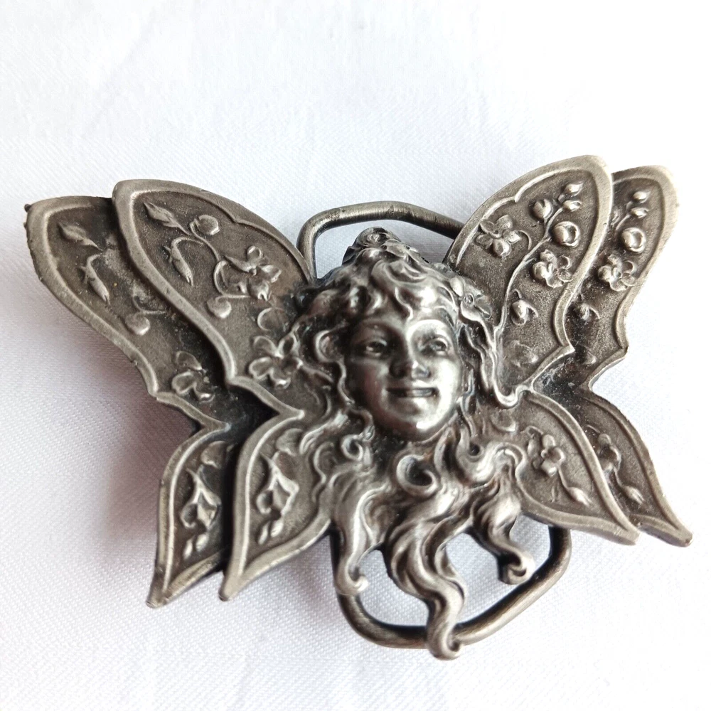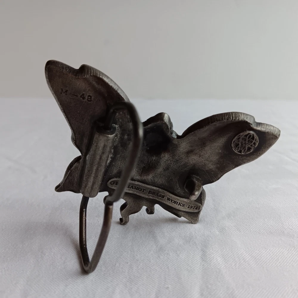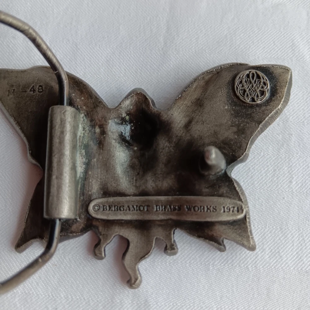 Vintage Bergamot Brass Works Belt Buckle featuring a whimsical design of fairy butterfly wings, crafted in pewter brass in the 1970s. This unique accessory is a true statement piece for any adult looking to add a touch of fantasy to their wardrobe. Made in the United States, this original piece captures the hippy vibe of the era with its intricate detailing and vintage charm. Perfect for collectors or those who appreciate retro accessories, this belt buckle is sure to stand out and make a statement.