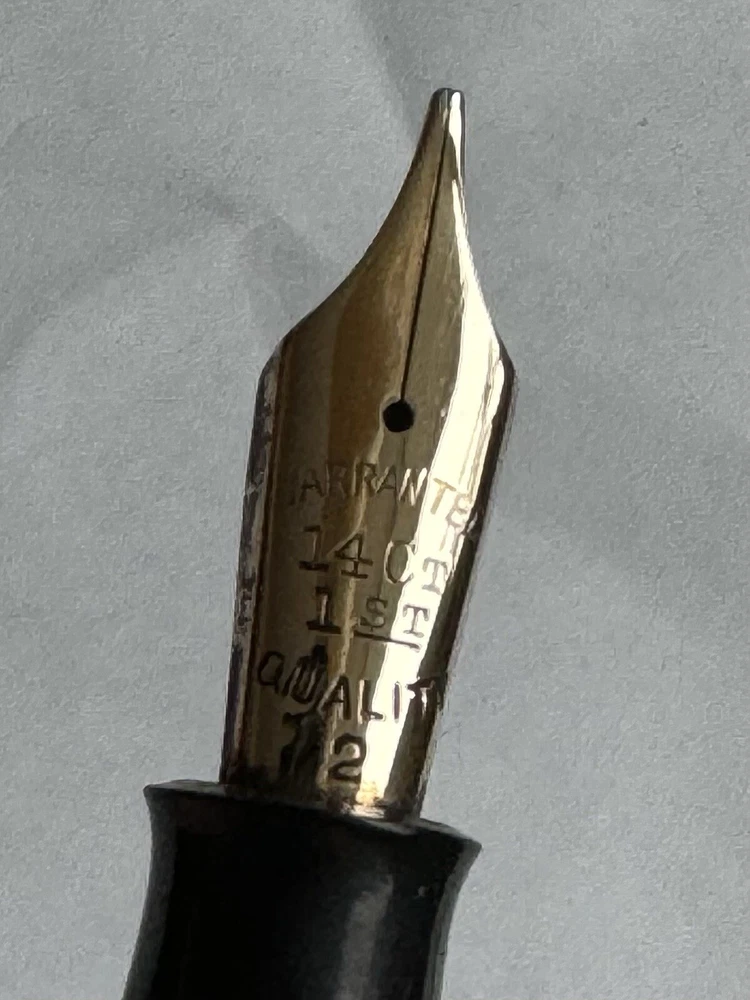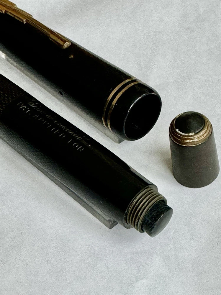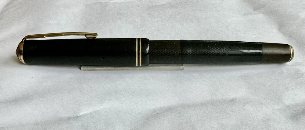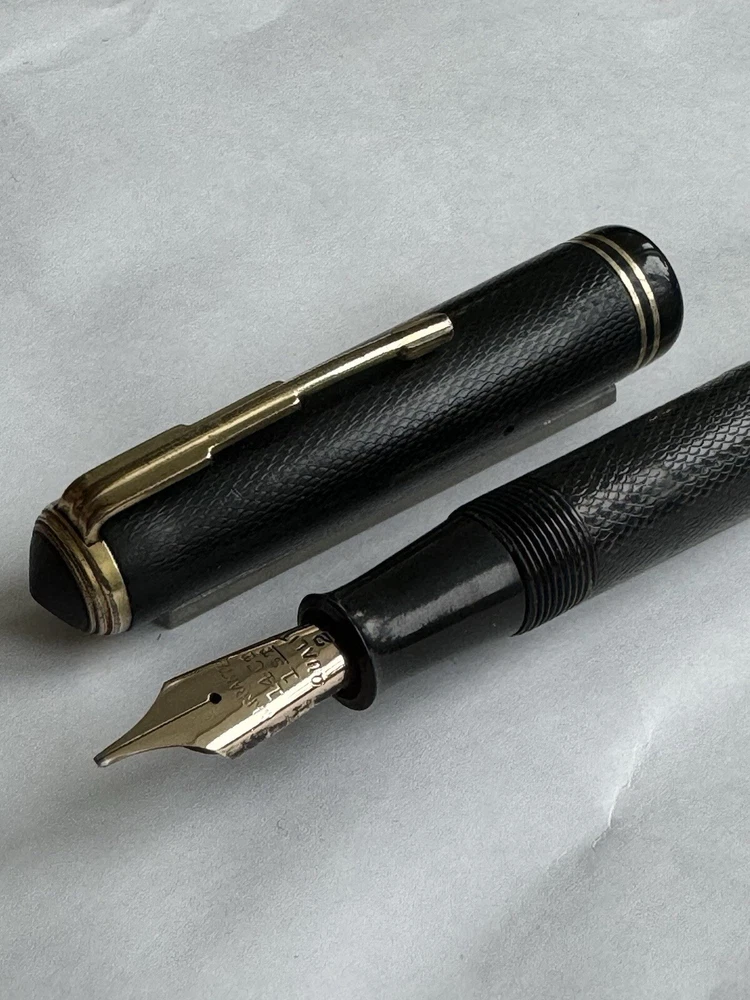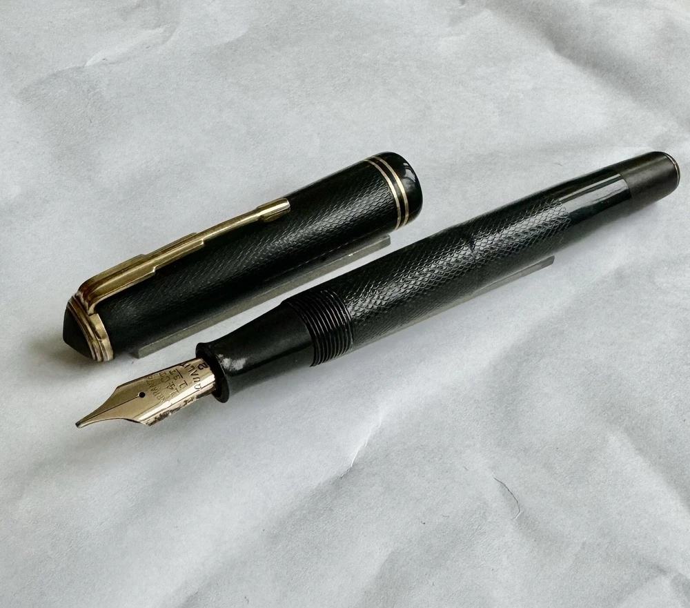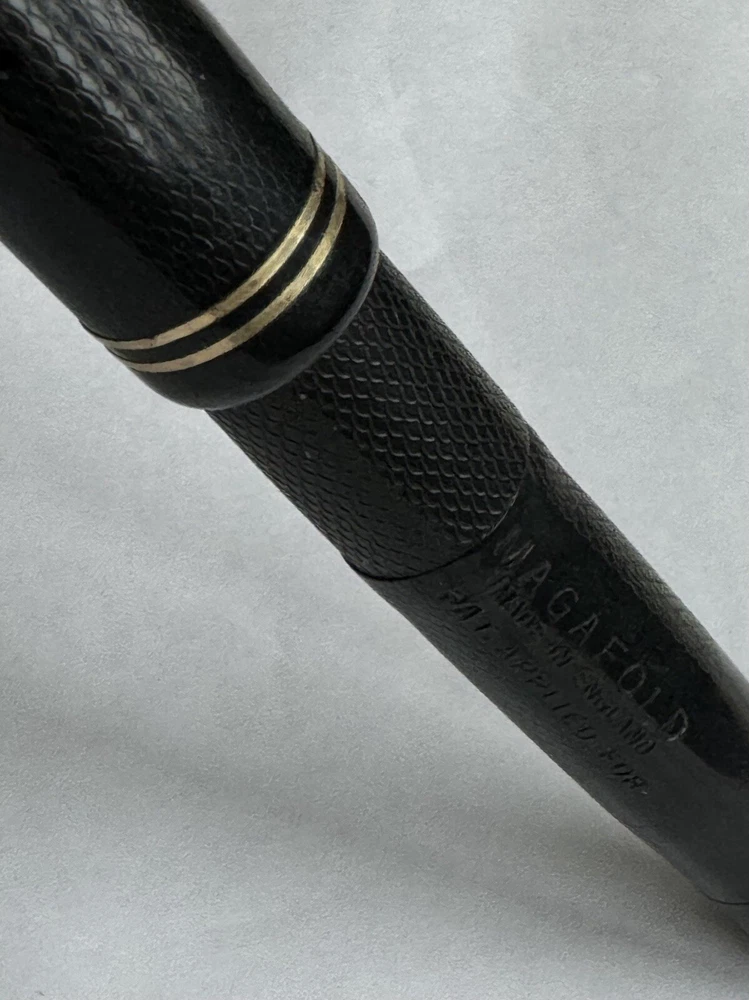 ART DECO STYLE: Black Magafold fountain pen. Made in United Kingdom in the 1930s. Beautifully cialized surface and elegant clip in pure art deco style. In good condition with no damage or repairs. The ink filling system is called "push button" filler. A new rubber bag must be inserted, after which ink can be added and the fountain pen will work again. L. 13.5 cm SHIPPING TO DENMARK COST 8.00 US DOLLARS. SHIPPING WITH REGISTERED MAIL. COST 24.00 US DOLLARS TO ANYWHERE IN THE WORLD. INCLUDED TRACK & TRACE. FULLY INSURED. THE PEN WILL BE INSPECTED FOR ERRORS AND DAMAGE AND THEN CLEANED BEFORE SALE. IF THERE IS DAMAGE, OBVIOUS ERRORS OR MISSING (AND ENGRAVINGS), THIS INFORMATION WILL BE ADDED TO THE AUCTION TEXT. THEY HAVE NOT BE SEPARATED (OR JUST ATTEMPTED TO BE SEPARATED). AND EXAMINED INTERNALLY. THIS PEN IS SOLD AS IS . IT HAS JUST BEEN CLEANED AND I HAVE EXAMINED IT AS WELL AS POSSIBLE. IF A PROBLEM ARISES WITH YOUR PURCHASE - CONTACT ME. WE WILL FIND A SOLUTION. DILEVERY TIME DEPENDS FROM BUYERS LOCATION, BUT IT CAN TAKE FROM 10-30 CALENDER DAYS. I ADVISE YOU TO WAIT UP TO 30 DAYS. Shipping within 48 hours after your payment is on my paypal account. Will combine shipping if more than one auction is won the same week. Satisfaction or your Money back gurantee..