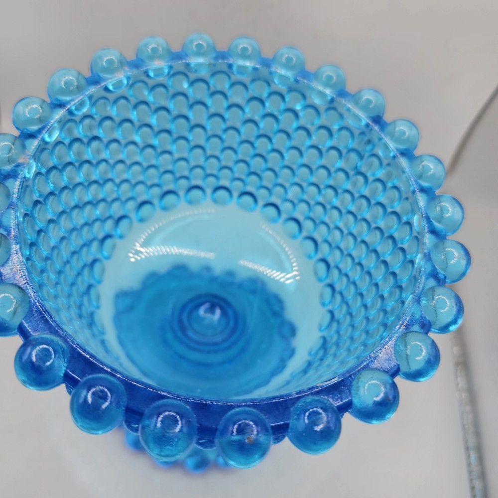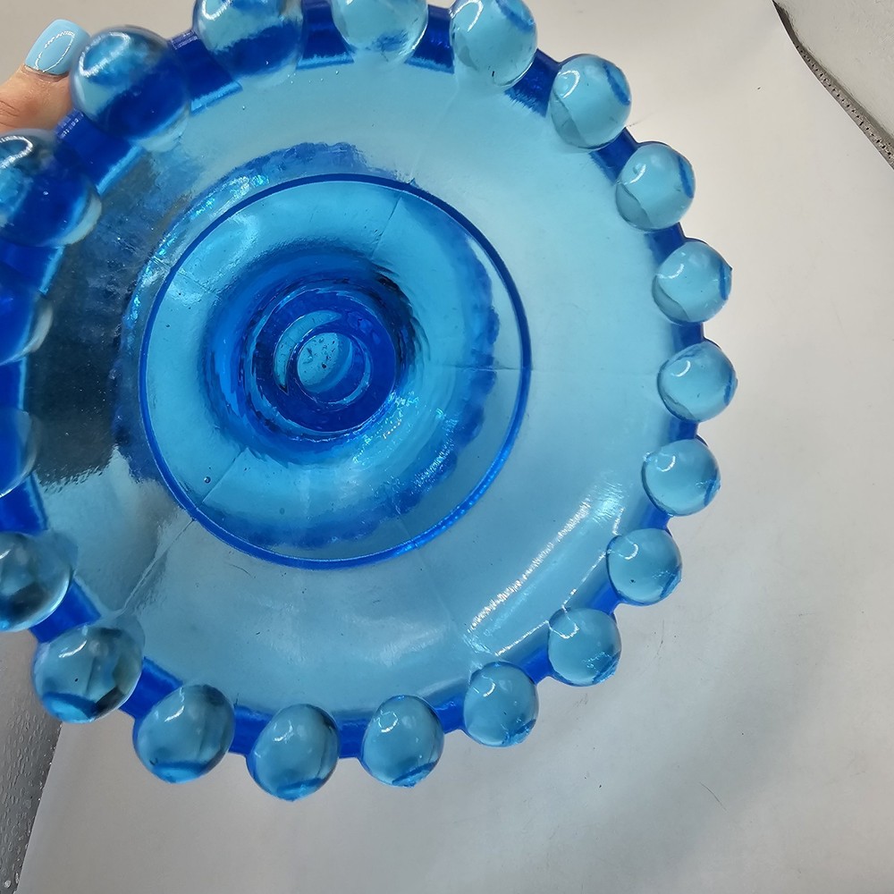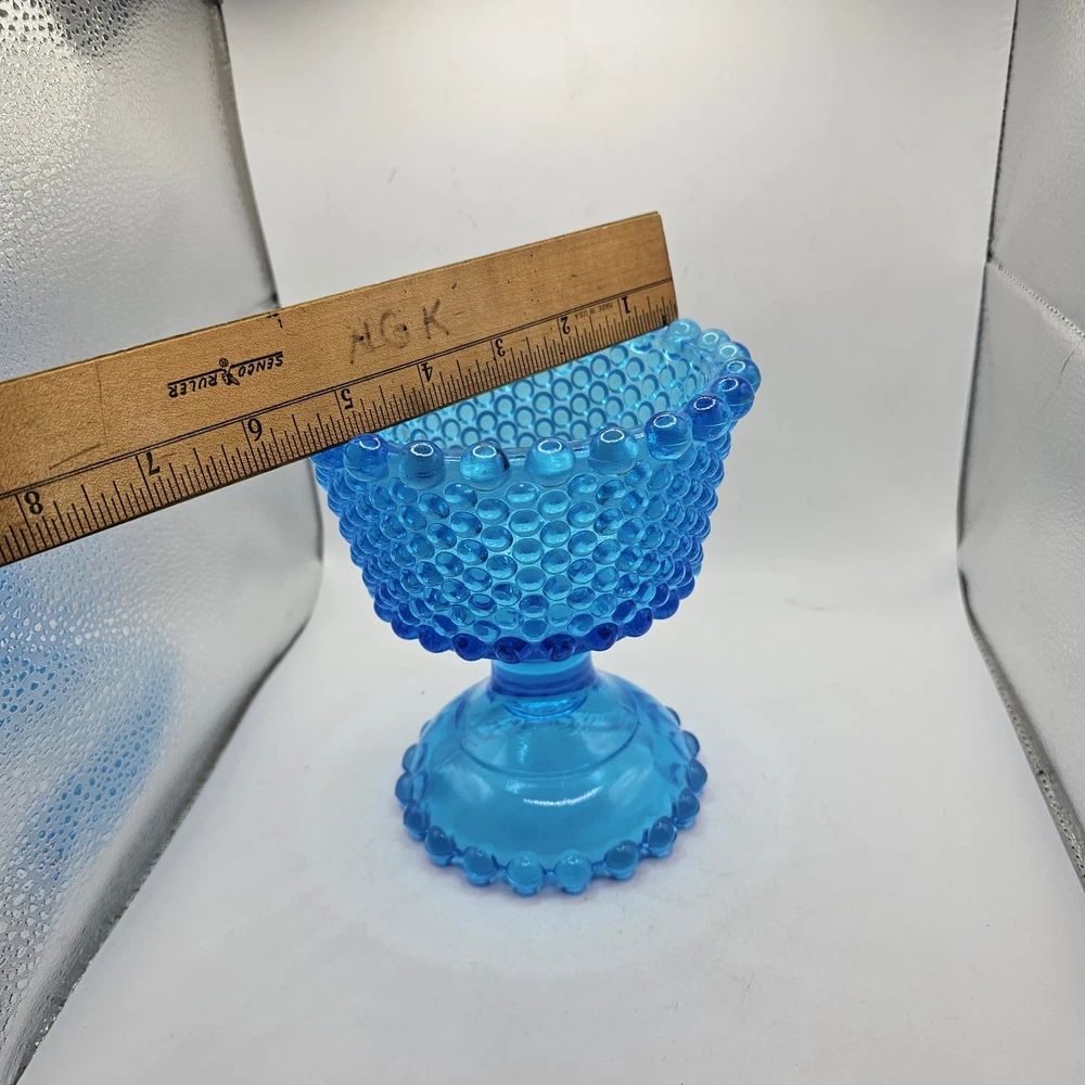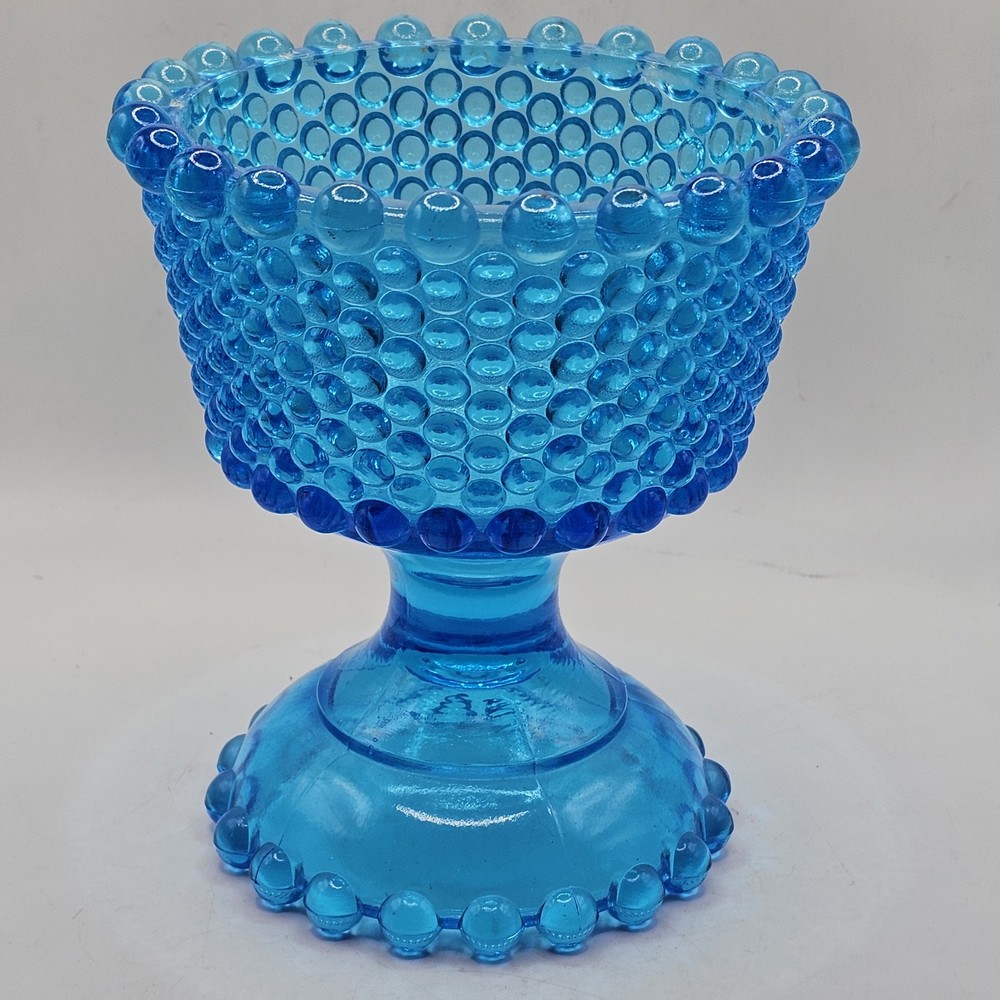 The vintage Blue Hobnail Glass Compote Bowl features a Thousand Eye design and measures 6 inches. The blue glass glows beautifully, making it a charming and decorative collectible piece.