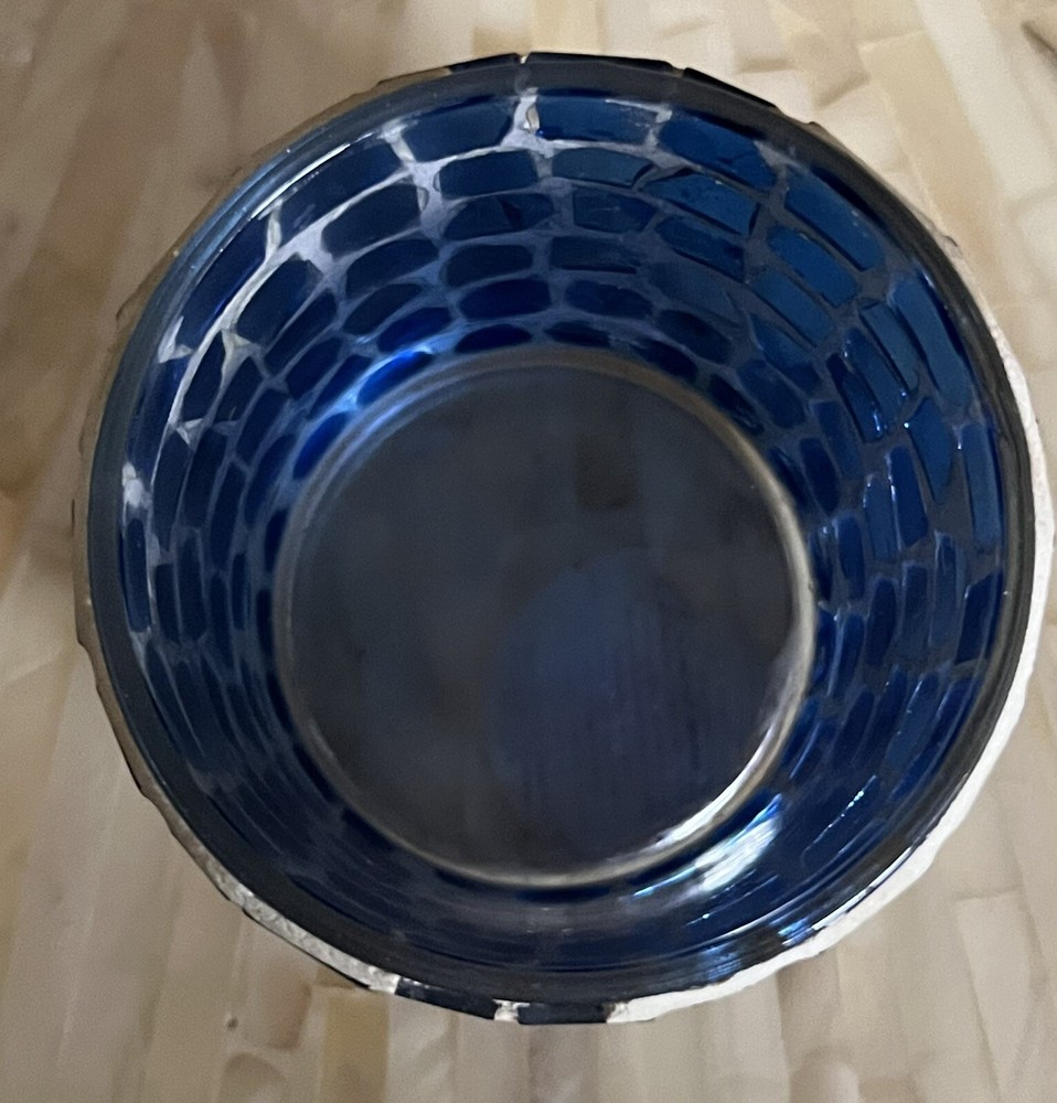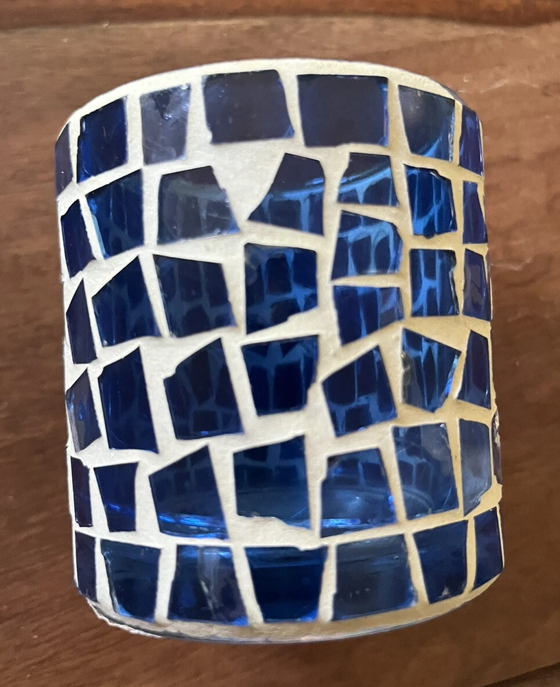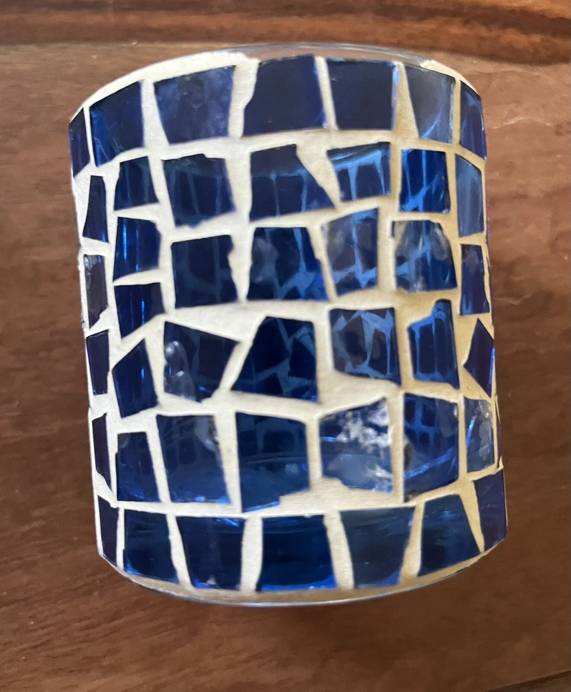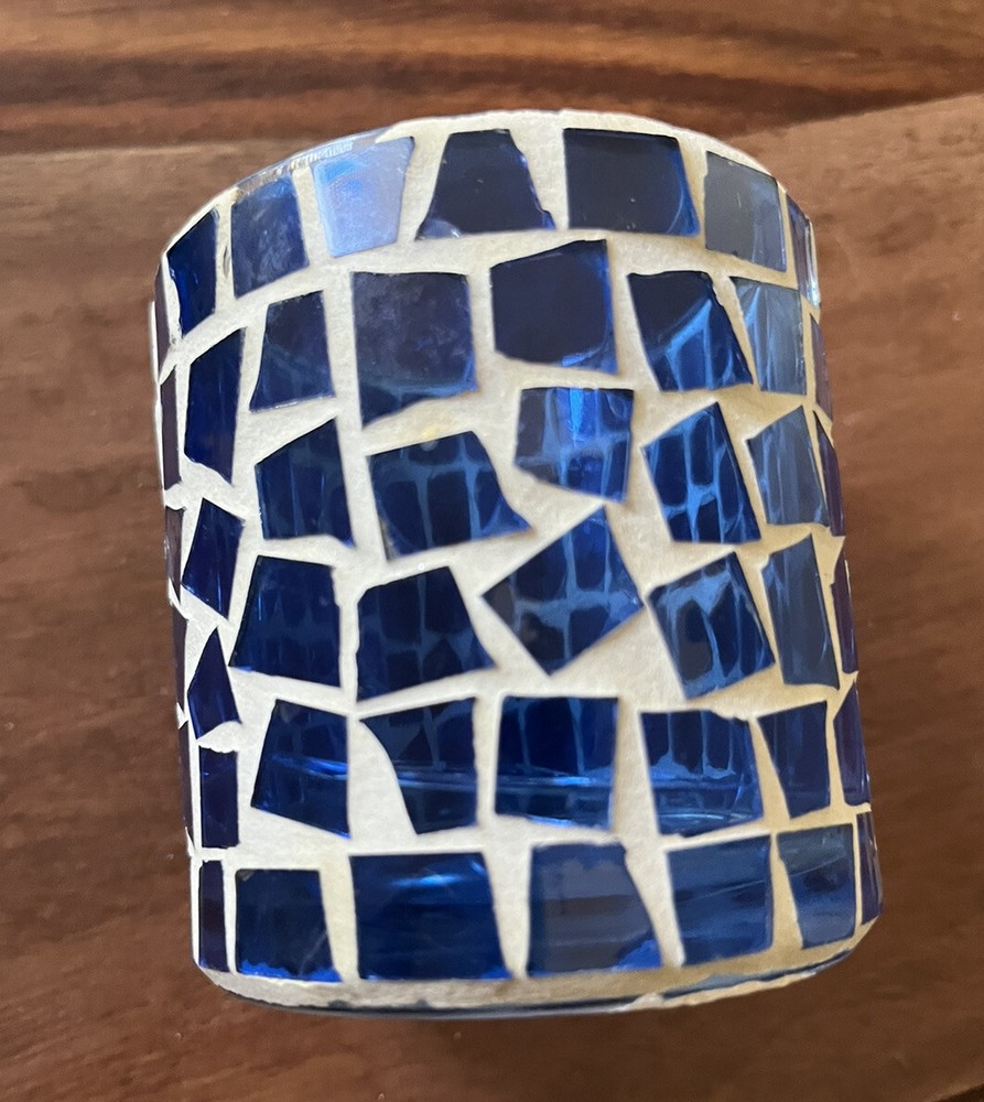 Blue Mosaic Glass Tealight Votive Candle Holder Vintage 3”h 3”d Vintage pre-owned - one tile has chip, some putty missing along rim. Please review images