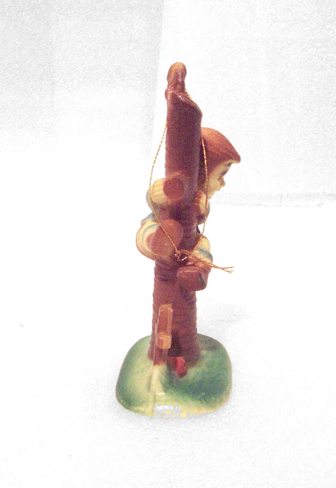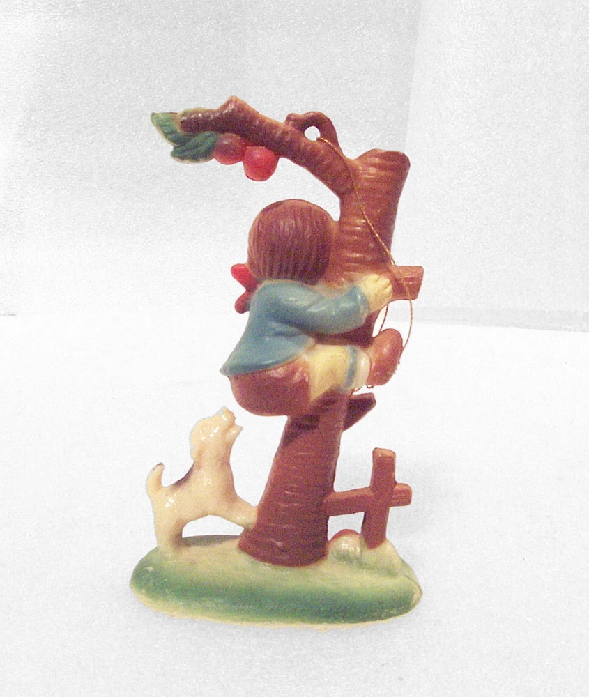 Vintage Boy being chased up a Tree by a Puppy Dog – Christmas Ornament. Hummel Style. Made in Hong Kong. Hard plastic. 4” tall x 2 3/8” wide x 1 ½” deep. Top cord for hanging; figure is free-standing also. Please Note: There is some paint missing the boy’s hair tips in front of face, side of one face and tips of neck bow. Item is being offered, “As Is”. It will be shipped in a small mailing box. PLEASE NOTE: Please forgive the Lighting. I do my best to describe the item as well as possible. In the event item does not arrive to you as described, Please contact me before leaving a Feedback. --------------------------- Buyer pays Actual Shipping plus $0.60 Packaging Fee. No Local Pickups. This item weighs approximately 0 pound 4 ounces US. All communications must be in English. Items are packaged prior to Listing, Therefore No Combined Shipping. --------------------------- If I do not receive a response from the winning bidder after one week, the item will be re-listed. Please contract us if you have any questions. Thank you for your consideration. ZDNZ 241210 4x4x4 C2019