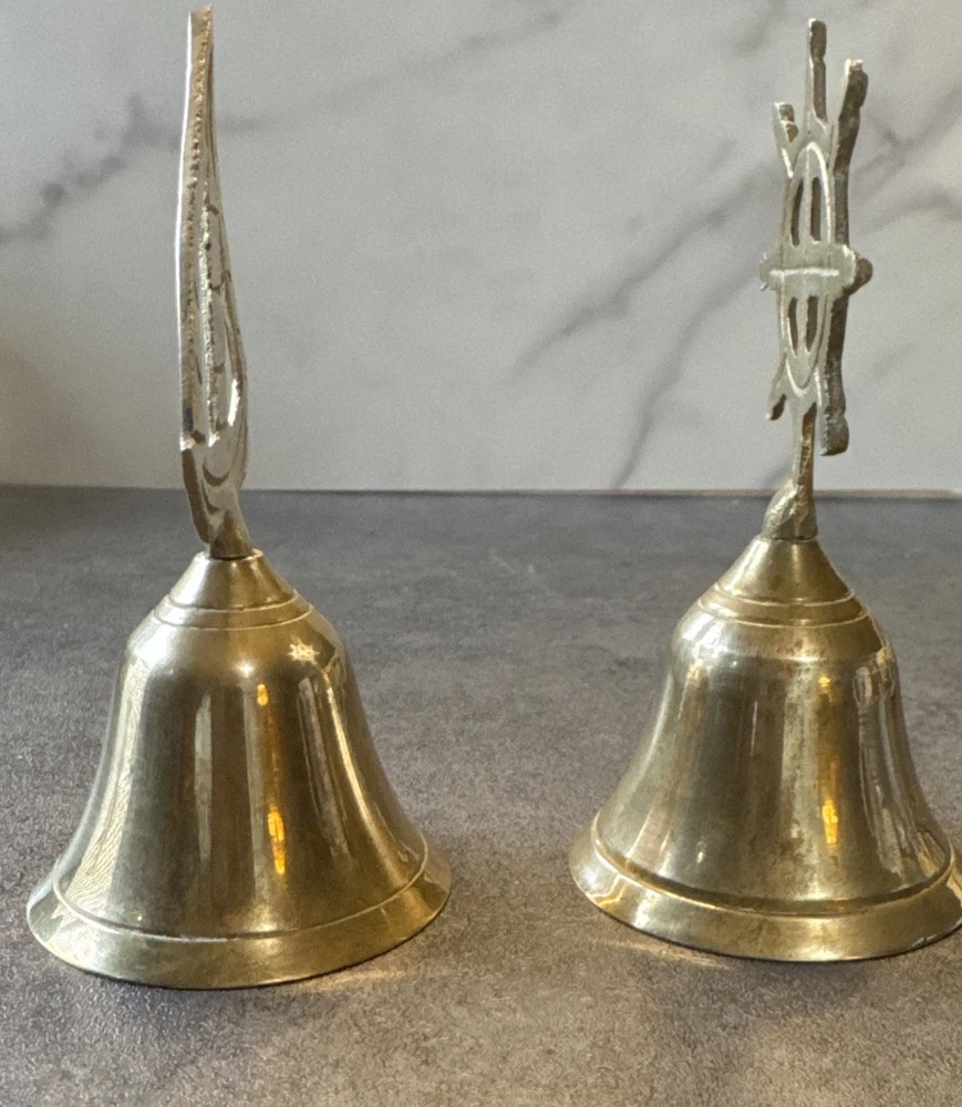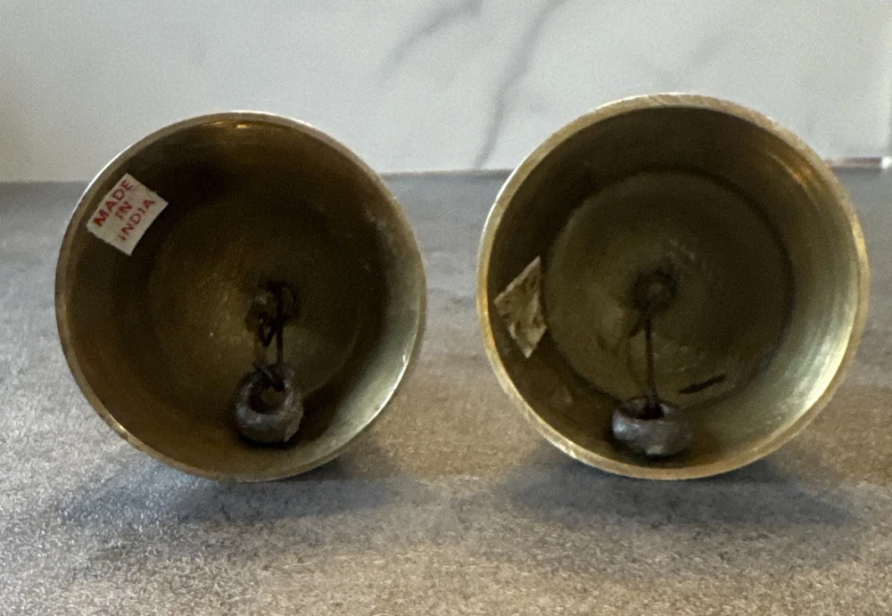 Add a touch of vintage charm to any room with this novelty set of 2 brass bells. The bells are shaped like a sailboat and captain's wheel, making them perfect for nautical themed decor. These small, unboxed bells are suitable for window, furniture, or wardrobe display. Crafted in India, the bells have a polished brass finish and are clean with Braso or Damn Cough. The unit quantity is 2, with each bell measuring 4.25 inches in height and 2 inches in length and width. These original, European style bells are perfect for all occasions and can be a great addition to any collection.
