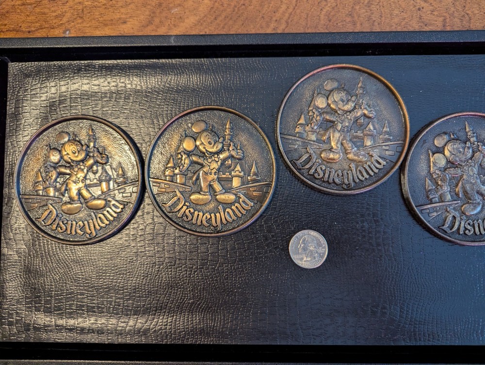 This vintage set of 4 Disneyland Mickey Mouse coasters features a metal bronze design, perfect for collectors of Disneyana memorabilia. Made in Canada and featuring the iconic character Mickey Mouse, these coasters are a nostalgic piece from the Walt Disney World franchise. The detailed metal craftsmanship and vintage appeal make these coasters a unique and sought-after addition to any Disney fan's collection.