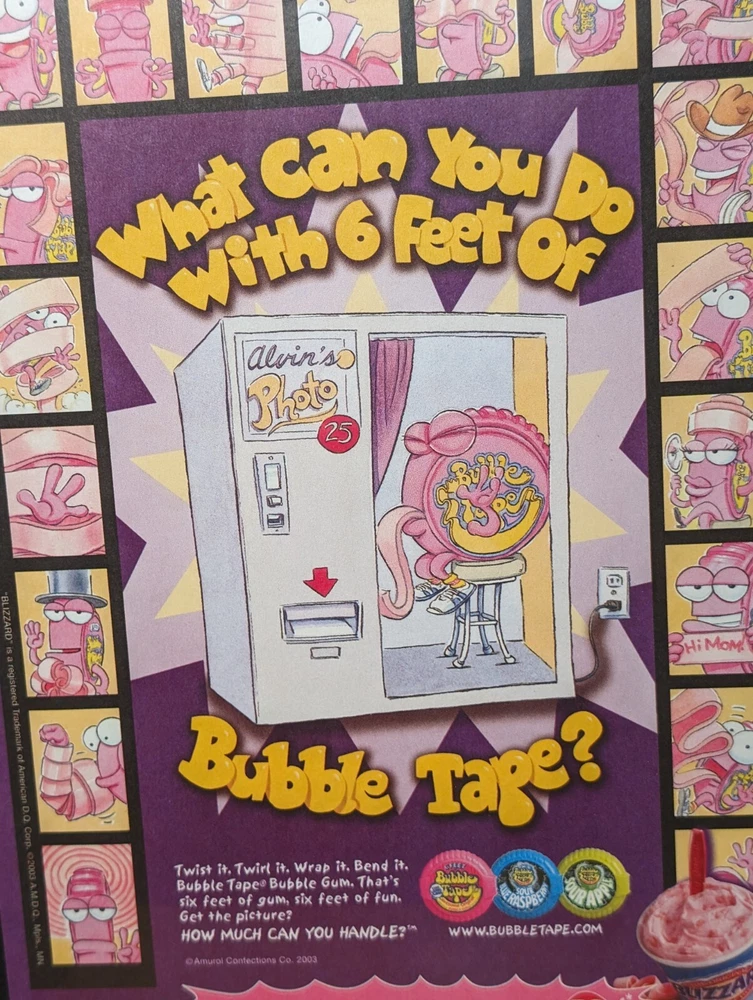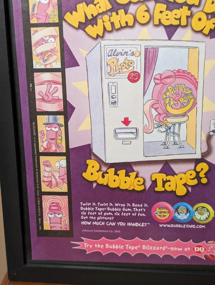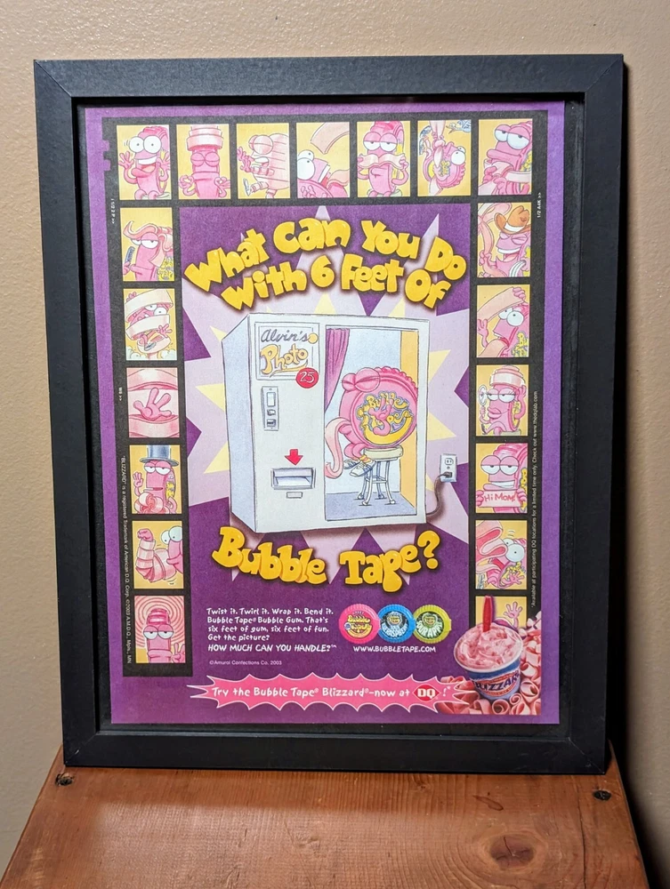 Frame is not included and is for display of advertisement. Measures roughly 6.5 x 10 inches. The ad can be centered or matted in any 8.5 x 11 inch frame for great a display This vintage Bubble Tape 2000s promo ad print poster art is a must-have for any collector. Featuring colorful graphics and this original piece is a great addition to any room or collection. Made in the United States, this poster is sure to impress and is in excellent condition. Perfect for fans of advertising and vintage collectibles, this original Bubble Tape poster is a rare find. Measuring 6.5/10in, this poster is an authentic piece of advertising history that is sure to delight. Don't miss out on the chance to own a piece of nostalgia, get your hands on this original Bubble Tape poster today!