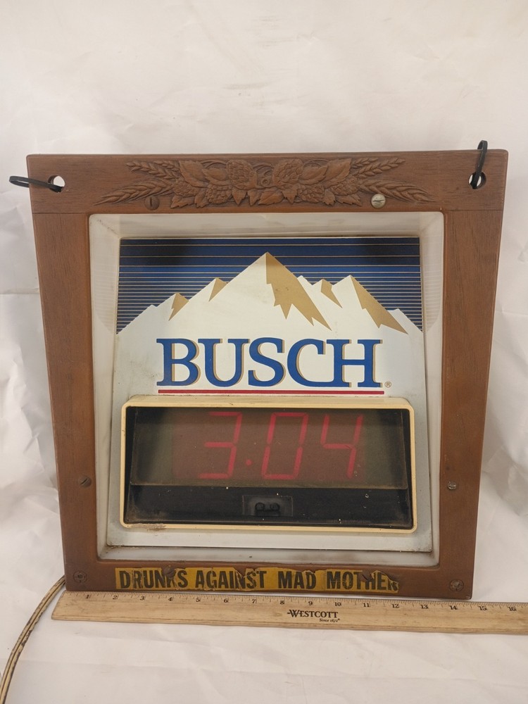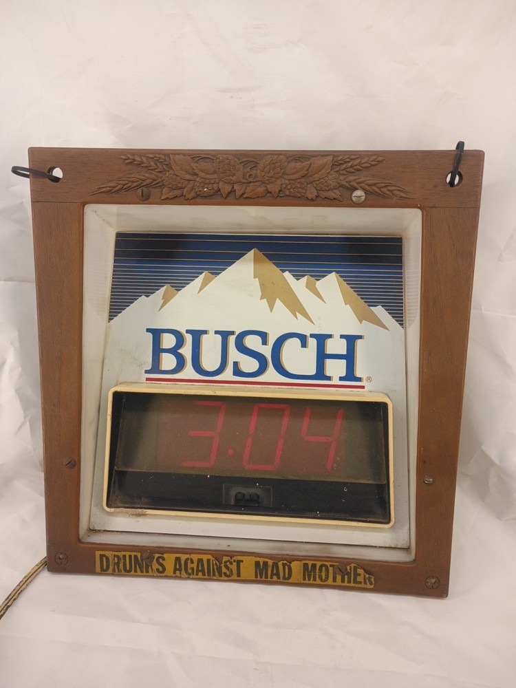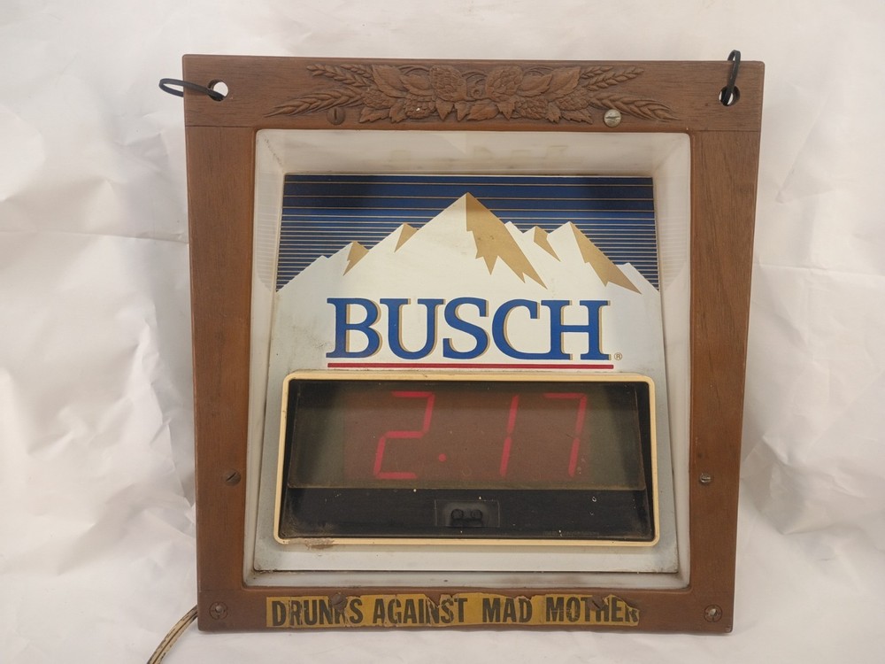 The product is a vintage Busch Beer Anheuser-Busch digital clock bar sign. This clock features a theme of Breweriana, making it a unique and collectible item for beer enthusiasts. Its design and branding make it a recognizable and nostalgic piece for those who appreciate vintage beer memorabilia. This clock needs some love the clock does work and iluminate, but when you use the buttons to change the time it jumps several minutes at a time making it hard to get set to the correct time, the cord has also been repaired with duct tape and would be suggested that it is replaced before putting the clock into use. This is also a vintage bar sign so it has been smoked around and would need a good cleaning to being it back to its glory . I am selling this item AS IS . Thank you for visiting my listing today and thank you for your interest in this item! My goal is to have a pleasant transaction resulting in a satisfied customer. I hope any transaction between us leaves you with a feeling of confidence knowing you can trust me and the items I offer here. *Most if not all my listings are set to accept offers. Feel free to send an offer and I will be happy to consider it!! *Please contact me with any questions or concerns and I will be happy to help. *Always examine the photos carefully, and if in doubt, email me with any questions you may have. *Please note that condition statements are offered as a guide only. They will always be somewhat subjective and reflect our opinion, which may not necessarily agree with someone else's opinion. PLEASE READ: I aim to please and I want my buyers to have a positive transaction with me. If you have questions, concerns, or special requests related to any of my items I hope you will contact me so we can work them out to your satisfaction. I sell my items to give you a great item at a decent price while making a little profit at the same time. If you feel the item you are interested in is too pricey do not hesitate to send me a fair offer and I will consider it. My goal is to satisfy your needs and mine so both parties can benefit. SHIPPING: If you prefer a different shipping method or company please contact me and I will do all I can to make that happen. If you have concerns or requests about the packaging of your item contact me and I will do all I can to accommodate them. Shipping costs are based on location in each state or country, the costs always differ. After I have received your payment I will ship your item out within 3 business days or less excluding weekends and holidays. BEFORE PURCHASING & BIDDING: **Please see all the pictures. I do not have great photography skills but I try to get the most accurate photos I can. If you are unsure about something you see in a photo contact me so I can do what I am able to answer your concern about the item. **I cannot stress enough that if you have any questions or concerns please contact me before purchasing and bidding. Communication can solve so much. **As a customer myself, I understand the meaning of customer satisfaction and my goal is to have nothing but satisfied customers. If you are not unsatisfied with your purchase I ask that you please contact me so I can take care of your issue. My goal is for you to be 100% satisfied. INTERNATIONAL BUYERS WELCOMED - PLEASE NOTE: I welcome International buyers! Please be aware that any custom/duties/taxes that the parcel might incur once it is out of the USA are the responsibility of the buyer. Please check with your country's customs office to determine what these additional costs will be prior to bidding or buying. Please refer to the eBay Site Map for more information if needed.